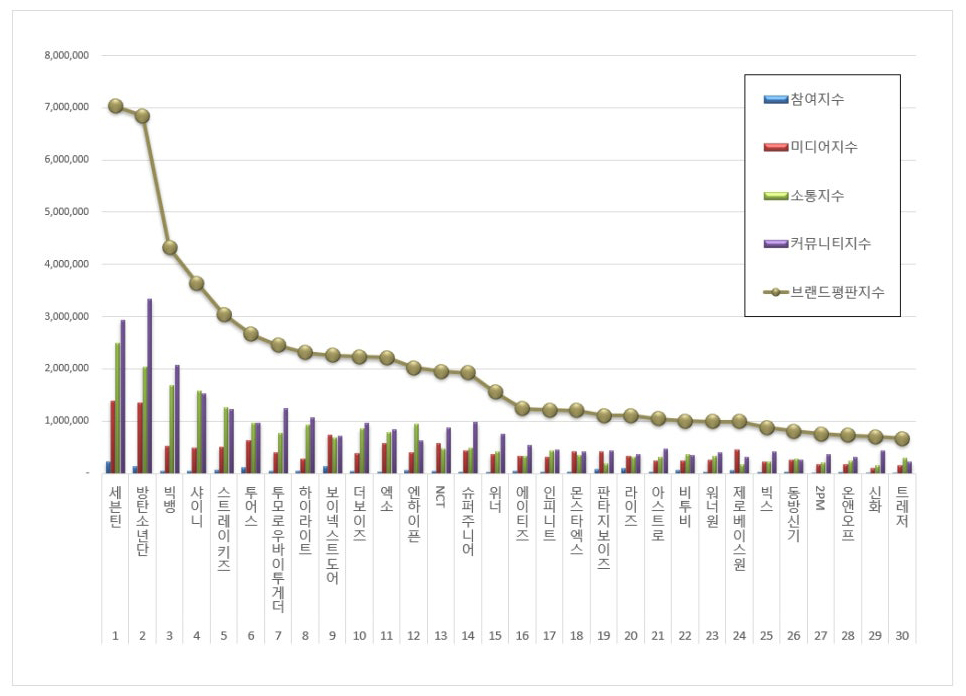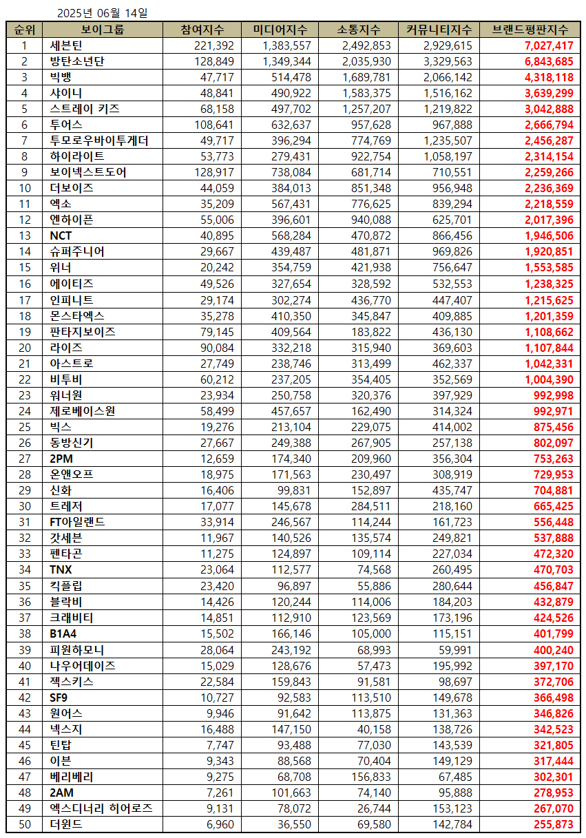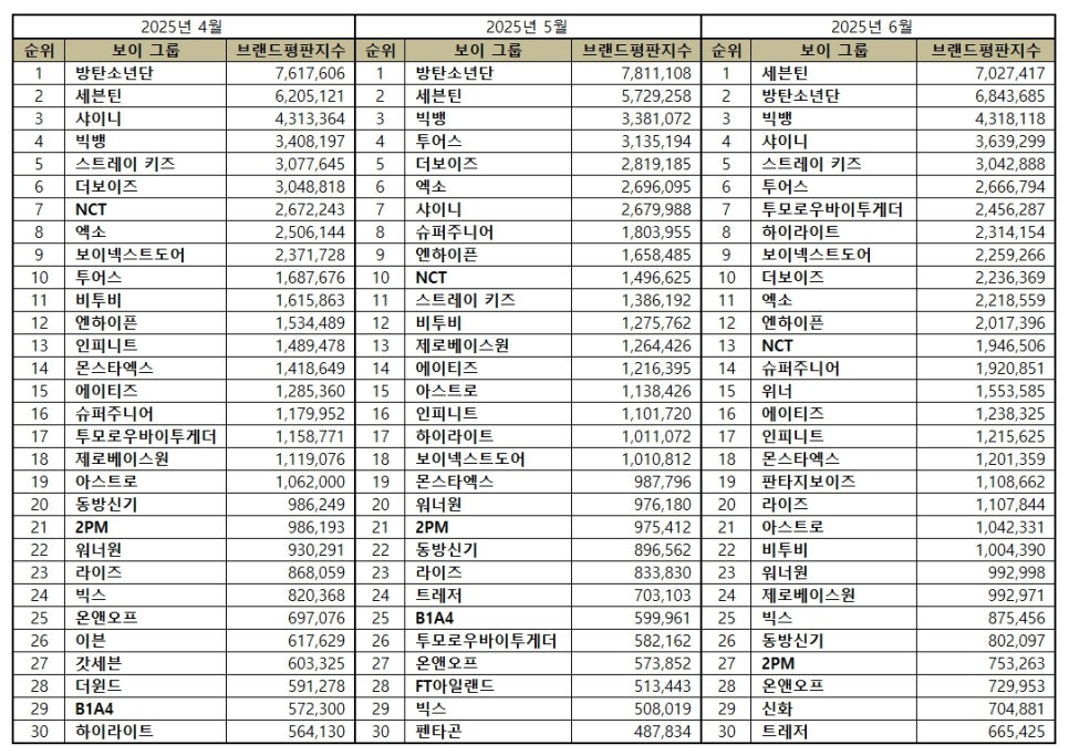 2025년 6월 보이그룹 브랜드평판 30위 순위는 세븐틴, 방탄소년단, 빅뱅, 샤이니, 스트레이 키즈, 투어스, 투모로우바이투게더, 하이라이트, 보이넥스트도어, 더보이즈, 엑소, 엔하이픈, NCT, 슈퍼주니어, 위너, 에이티즈, 인피니트, 몬스타엑스, 판타지보이즈, 라이즈 , 아스트로, 비투비, 워너원, 제로베이스원, 빅스, 동방신기, 2PM, 온앤오프, 신화, 트레저 순으로 분석됐다.