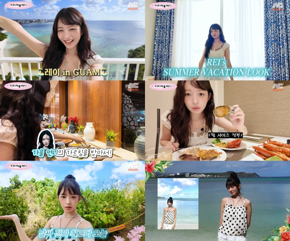 첫 괌 여행인 만큼, '올타임 트렌드 세터' 레이는 OOTD에도 남다른 센스를 더했다. 괌의 분위기에 맞춘 모아나 느낌의 헤어스타일은 물론 휴양지 무드를 살린 상의와 웰컴 레이(lei), 할머니에게 선물 받은 목걸이가 시원시원하면서도 사랑스러운 레이표 서머룩을 완성했다.