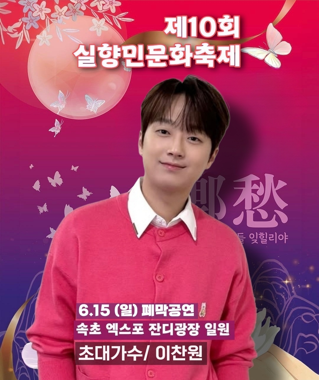 이찬원은 15일 오후 7시 강원특별자치도 속초시 조양동 속초 엑스포 잔디광장에서 열리는 '제10회 실향민문화축제' 폐막식 마무리 공연에 출연한다.