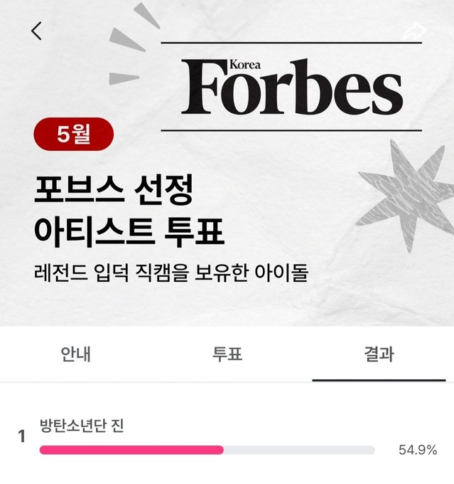 진은 지난 5월 26일부터 6월 15일까지 엠넷 플러스(Mnet Plus)에서 진행된 포브스(Forbes Korea) 선정 아티스트 투표 '레전드 입덕 직캠을 보유한 아이돌' 1위에 올랐다. 진은 54.9%의 높은 득표율로 최고의 자리를 차지했다.