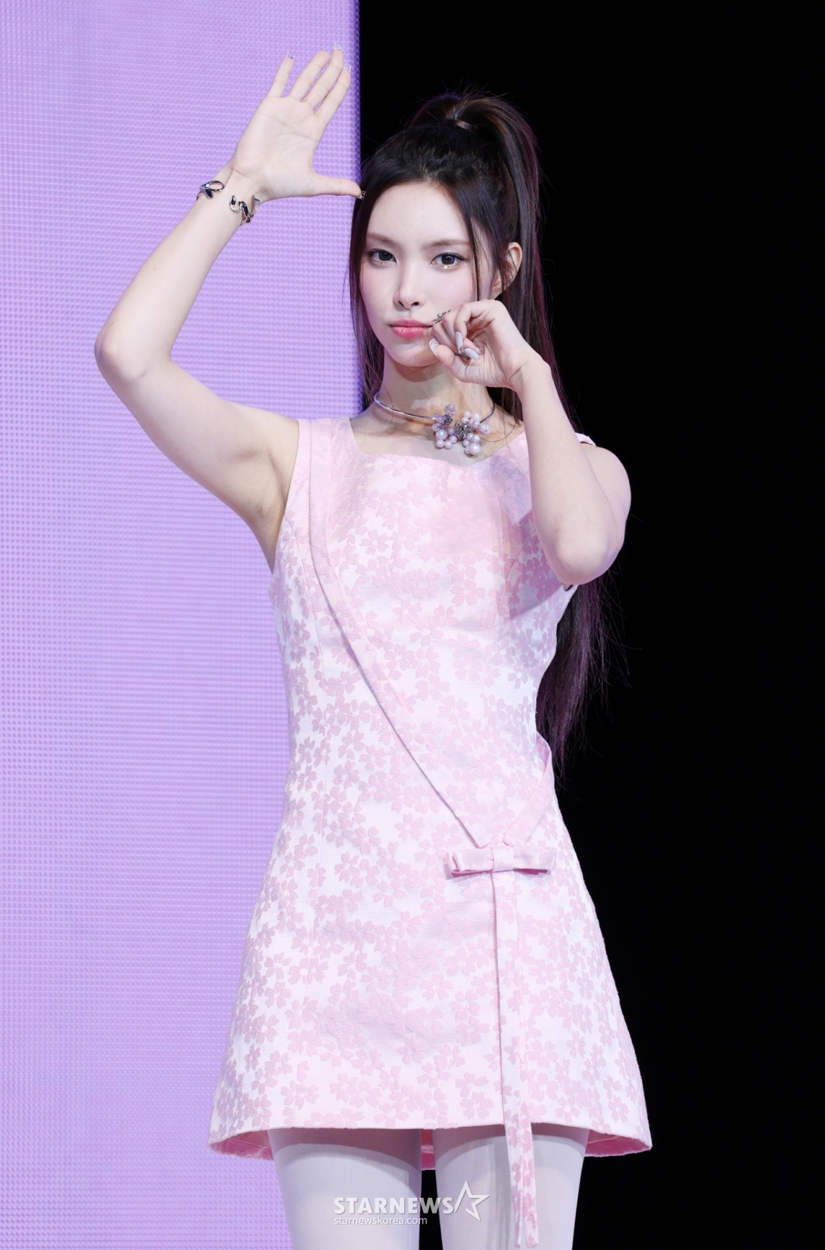 그룹 아일릿 민주가 16일 서울 광진구 예스24 라이브홀에서 진행된 미니 3집 앨범 'bomb' 발매 기념 쇼케이스에서 포즈를 취하고 있다. /2025.06.16 /사진=김휘선 hwijpg@
