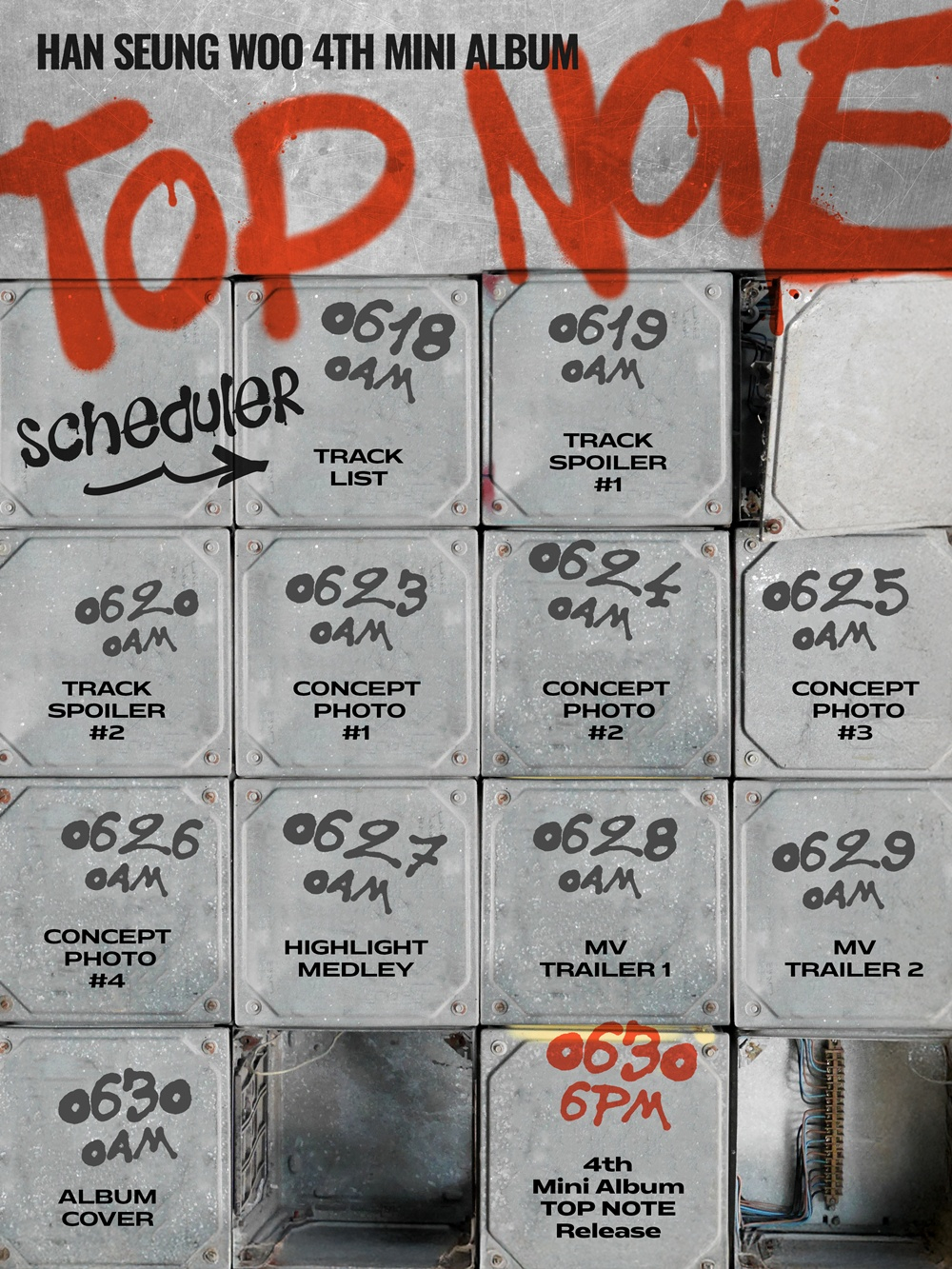 한승우는 17일 0시 공식 SNS 채널을 통해 네 번째 미니앨범 'TOP NOTE(탑 노트)'의 스케줄러 이미지를 공개했다.