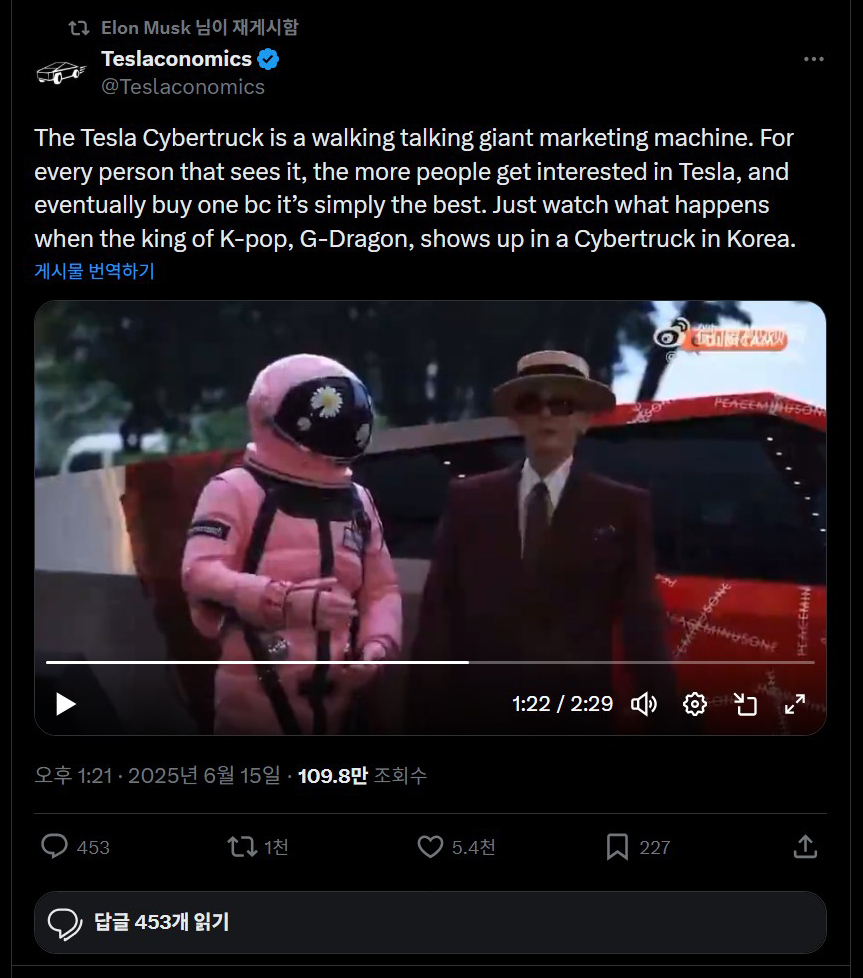 15일 일론 머스크는 "케이팝의 제왕 지드래곤이 사이버트럭을 타고 한국에 나타나면 어떤 일이 벌어질지 지켜보세요.(Just watch what happens when the king of K-pop, G-Dragon, shows up in a Cybertruck in Korea)"라는 내용의 'Teslaconomics' 글을 리트윗했다.