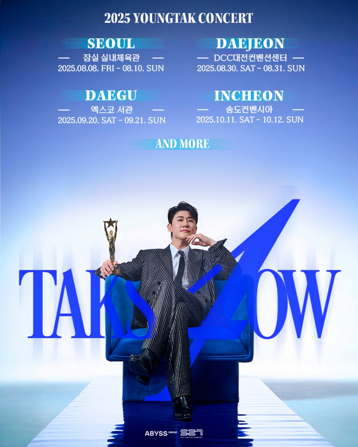 올해로 4회를 맞이하는 영탁의 전국 투어 'TAK SHOW4'는 서울을 시작으로 대전 DCC대전컨벤션센터 8월 30일~31일, 대구 엑스코 서관 9월 20일~21일, 인천 송도컨벤시아 10월 11일~12일 4개 도시 개최를 확정했다. 추후 일정에 따라 다른 지역에서 공연 개최도 이어갈 예정이다.