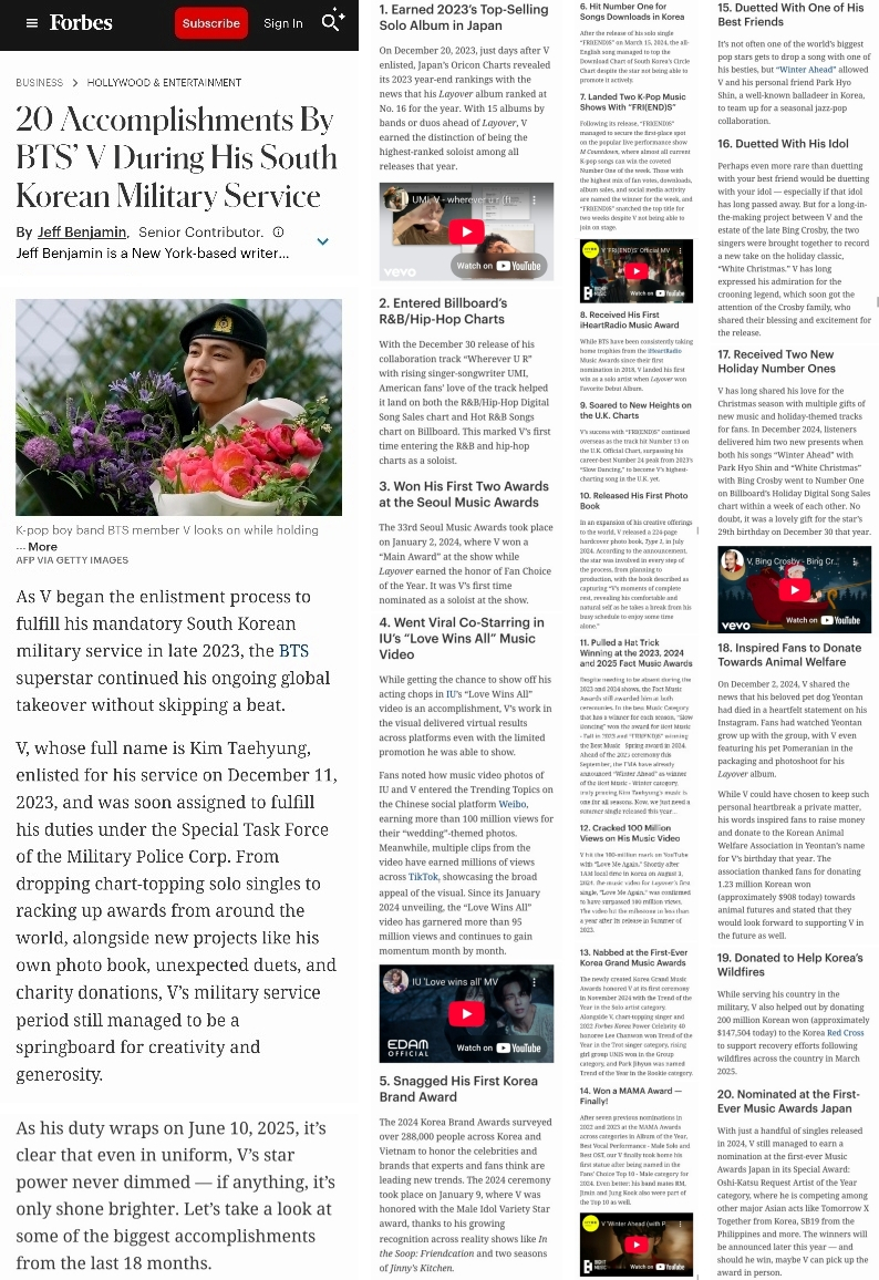 방탄소년단(BTS) 뷔가 군 복무 중 이룬 성과 20가지에 대해 포브스(Forbes)가 집중 조명했다.