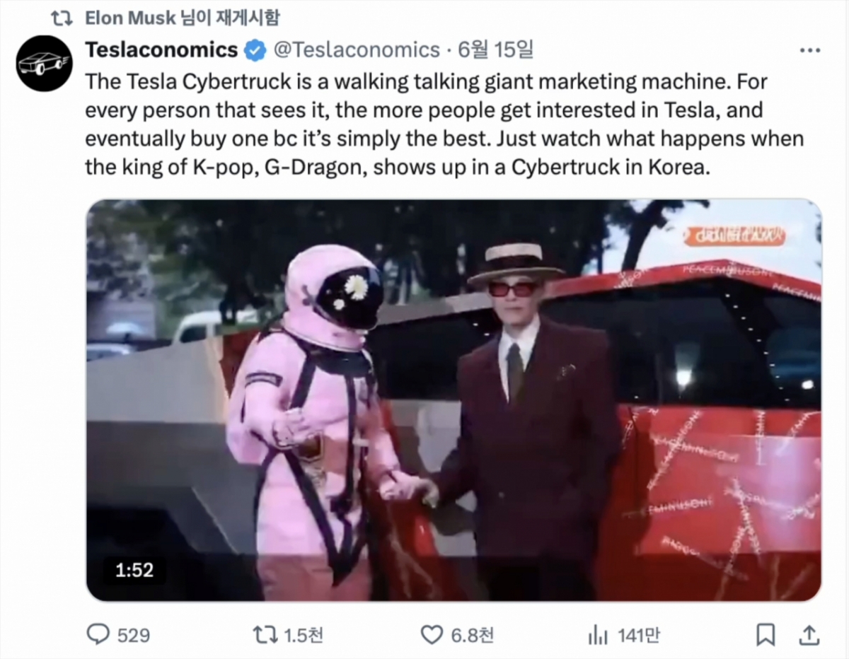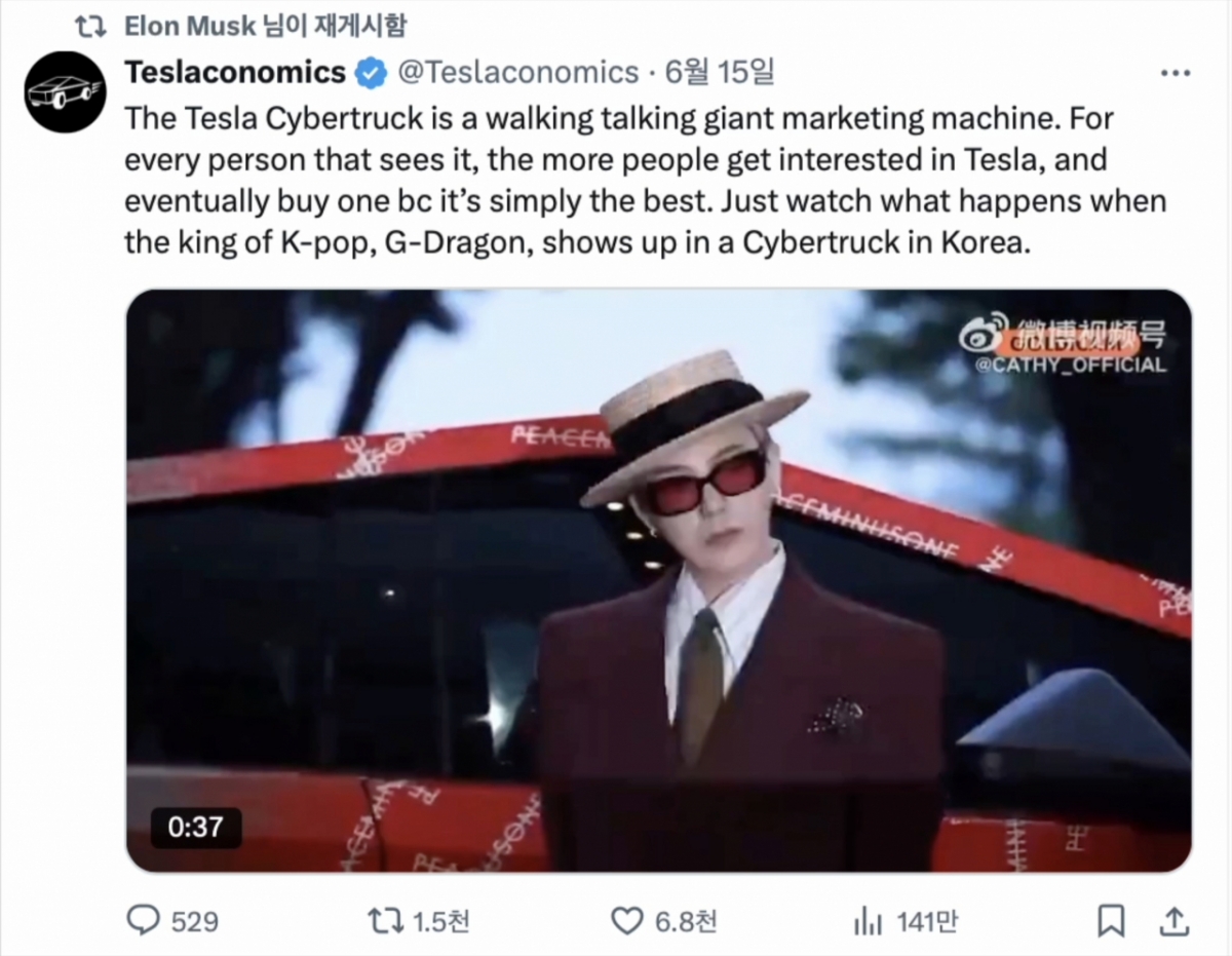 그런 가운데 테슬라 최고경영자(CEO)인 일론 머스크가 G-DRAGON의 사이버트럭 탑승 영상을 리트윗해 화제를 모으고 있다. 그가 리트윗한 'Teslaconomics'의 게시물에는 "K-Pop의 제왕 지드래곤이 사이버트럭을 타고 한국에 나타나면 어떤 일이 벌어질지 지켜보세요(Just watch what happens when the king of K-pop, G-Dragon, shows up in a Cybertruck in Korea)"라는 문구와 함께 사이버트럭에서 내려 행사장으로 들어서는 G-DRAGON의 모습이 담겨있다. 해당 영상은 일론 머스크가 리트윗함으로써 17일 기준 조회수 139만을 돌파하며 폭발적인 반응을 자아내고 있다.