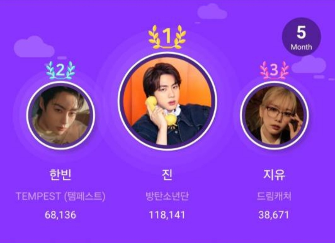 진은 지난 5월 1일부터 15일까지 글로벌 팬덤 플랫폼 스타 플래닛(STAR PLANET)에서 진행한 5월 아이돌 랭킹에서 11만 8141표로 압도적인 1위를 차지했다.