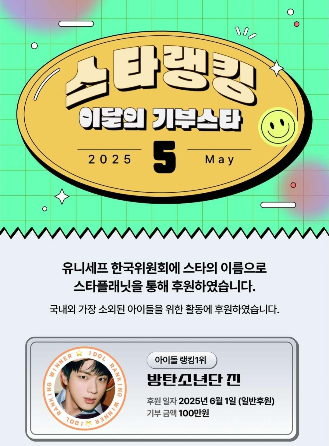 스타 플래닛은 5월 아이돌 랭킹 1위를 차지한 진의 이름으로 6월 1일 유니세프 한국위원회에 100만 원의 기부금을 전달했다고 밝혔다.