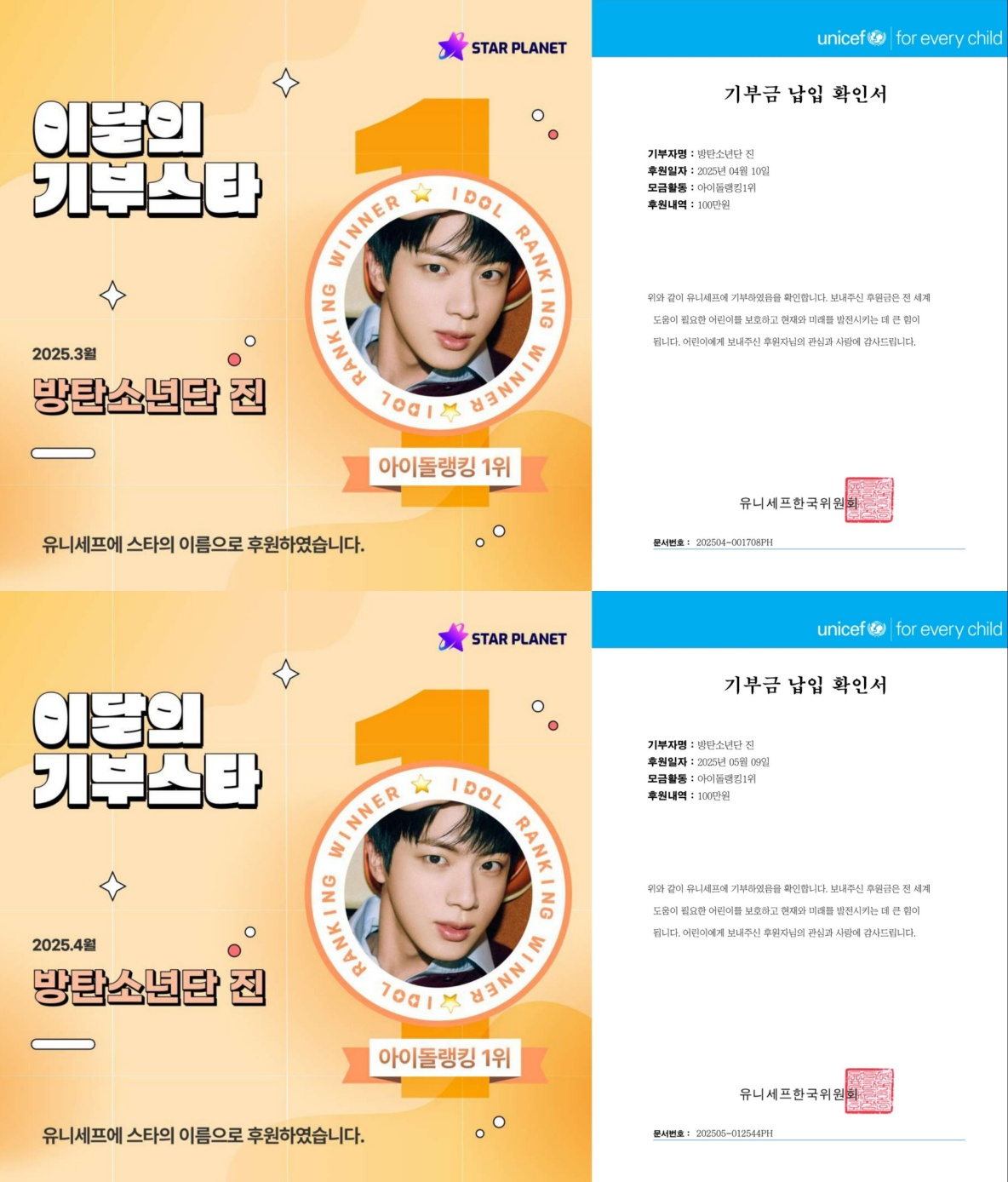 앞서 3월과 4월 아이돌 랭킹에서도 진이 1위를 차지하며 기부 요정에 등극, 유니세프 한국위원회에 각각 100만원의 기부금이 전달됐다.