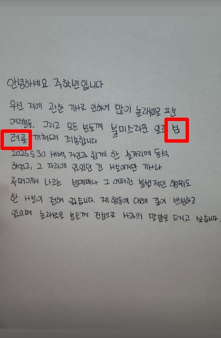 사생활 논란으로 그룹 더보이즈에서 퇴출된 주학년이 자필 사과문을 공개하자, 이번엔 사과문 대필 의혹이 일고 있다.