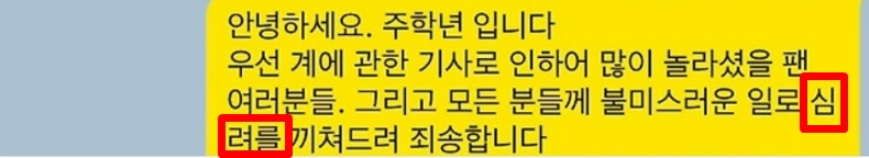 실제로 네티즌들이 확인한 결과, 주학년의 사과문 전체를 카카오톡 메시지로 보내자 '심'에서 끊어진 후 다음 줄에서 '려를'로 이어지는 현상이 발견됐다.