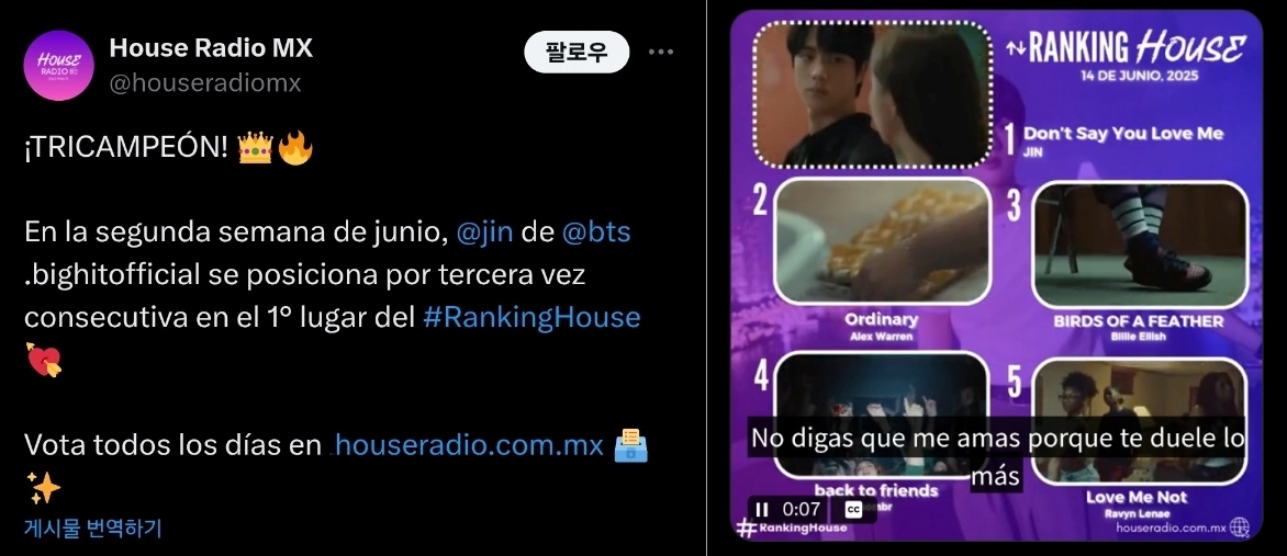 'Don't Say You Love Me'는 최근 발표된 멕시코의 인기 라디오 House Radio MX에서도 1위를 차지, 3주 연속 1위에 오르며 압도적인 인기와 파워를 증명했다. 2위는 미국 Alex Warren(알렉스 워렌)의 'Ordinary', 3위는 미국 Billie Eilish(빌리 아일리시)의 'BIRDS OF A FEATHER'가 차지했다.