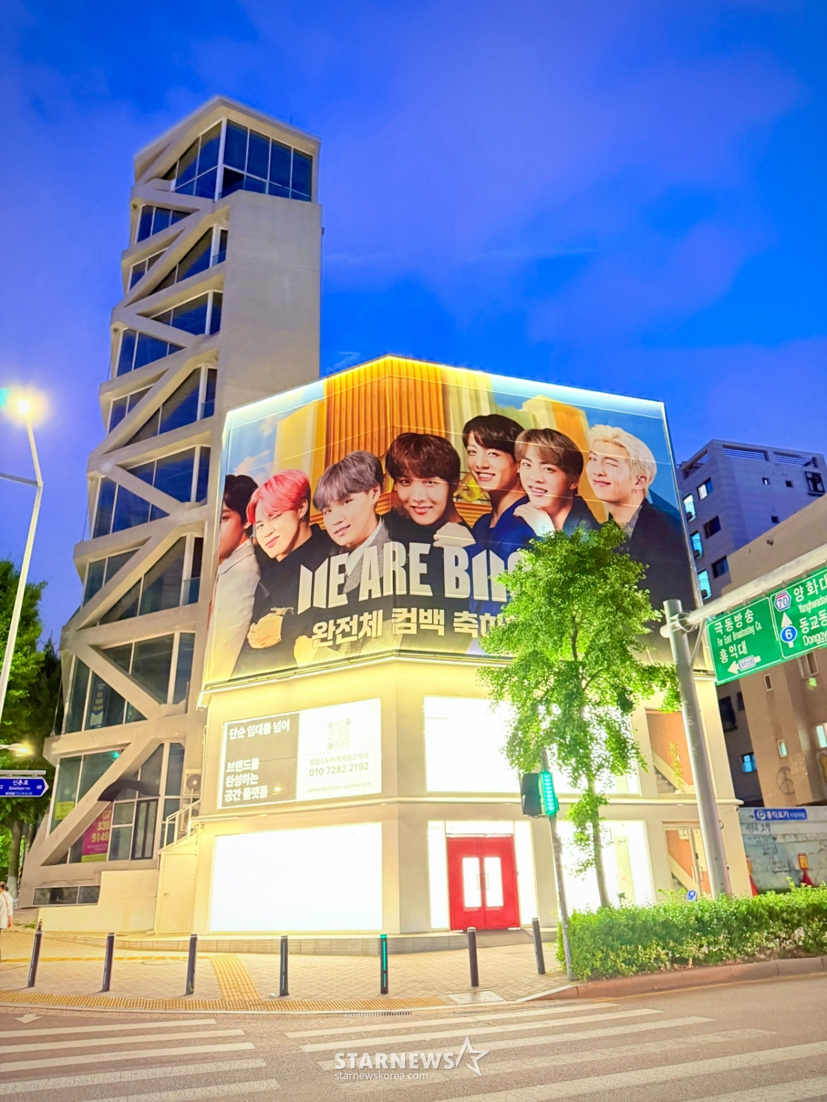 최근 홍대입구역 인근 피시스 아카이브(Pieces Archive) 건물 외벽에는 "WE ARE BACK – 완전체 컴백 축하해!"라는 문구가 담긴 초대형 광고가 설치되었으며, 광고 속에는 정국을 비롯한 BTS 7명의 미소가 함께 담겨 팬들의 마음을 울리고 있다.