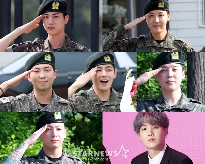 입대 순서와 마찬가지로 진이 먼저 지난해 6월 육군 만기 전역했고, 제이홉은 같은해 10월, RM과 뷔, 지민, 정국은 이달 군 복무를 마치며 사회로 돌아왔다.
