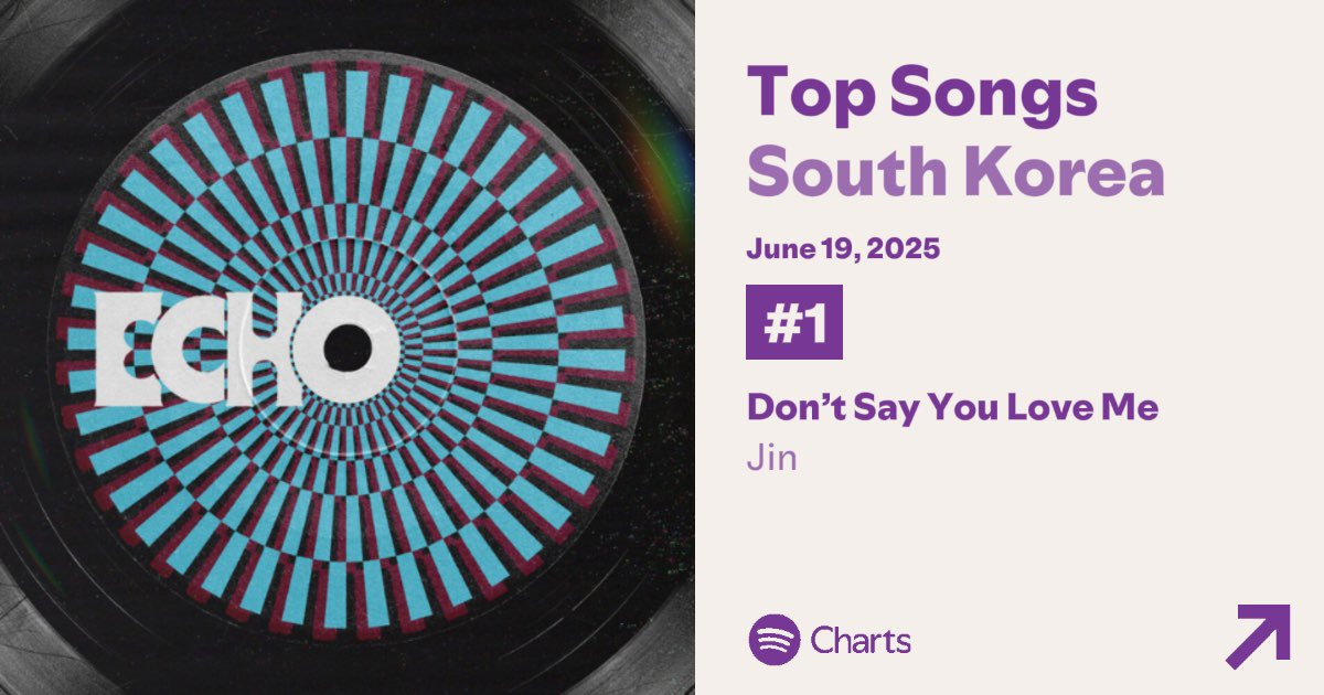 진의 'Don't Say You Love Me'는 같은 날 스포티파이 재팬에서도 1위(6월 19일자)를 유지하며 일본에서 24일간 1위를 이어갔다. 같은날 글로벌(전 세계) 스포티파이에서는 6위를 차지했다.