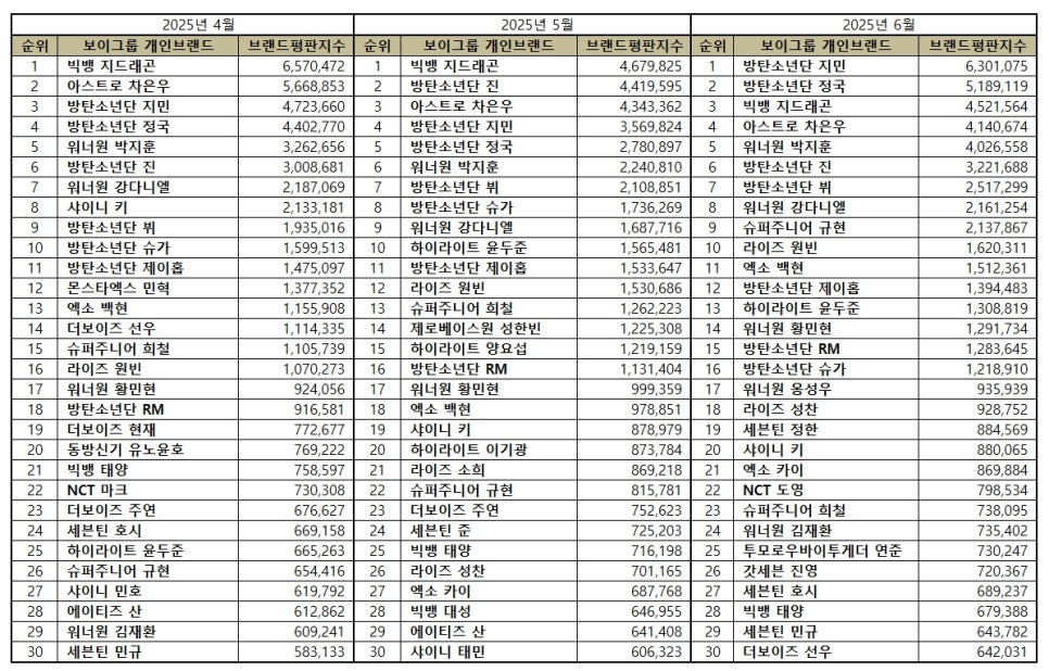 2025년 6월 보이그룹 개인 브랜드평판 30위 순위는 방탄소년단 지민, 방탄소년단 정국, 빅뱅 지드래곤, 아스트로 차은우, 워너원 박지훈, 방탄소년단 진, 방탄소년단 뷔, 워너원 강다니엘, 슈퍼주니어 규현, 라이즈 원빈, 엑소 백현, 방탄소년단 제이홉, 하이라이트 윤두준, 워너원 황민현, 방탄소년단 RM, 방탄소년단 슈가, 워너원 옹성우, 라이즈 성찬, 세븐틴 정한, 샤이니 키, 엑소 카이, NCT 도영, 슈퍼주니어 희철, 워너원 김재환, 투모로우바이투게더 연준, 갓세븐 진영, 세븐틴 호시, 빅뱅 태양, 세븐틴 민규, 더보이즈 선우 순으로 분석됐다.