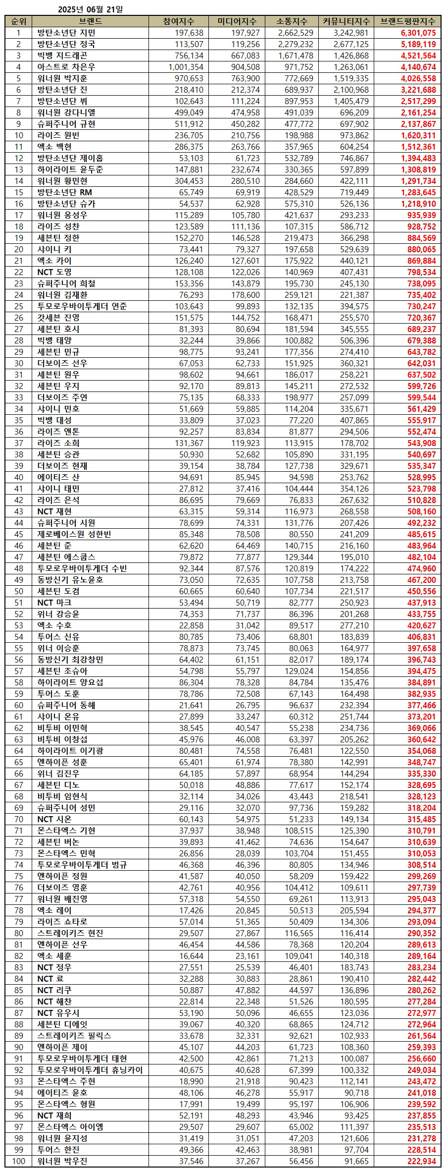 2025년 6월 보이그룹 개인 브랜드평판 100위 브랜드는 방탄소년단 지민, 방탄소년단 정국, 빅뱅 지드래곤, 아스트로 차은우, 워너원 박지훈, 방탄소년단 진, 방탄소년단 뷔, 워너원 강다니엘, 슈퍼주니어 규현, 라이즈 원빈, 엑소 백현, 방탄소년단 제이홉, 하이라이트 윤두준, 워너원 황민현, 방탄소년단 RM, 방탄소년단 슈가, 워너원 옹성우, 라이즈 성찬, 세븐틴 정한, 샤이니 키, 엑소 카이, NCT 도영, 슈퍼주니어 희철, 워너원 김재환, 투모로우바이투게더 연준, 갓세븐 진영, 세븐틴 호시, 빅뱅 태양, 세븐틴 민규, 더보이즈 선우, 세븐틴 원우, 세븐틴 우지, 더보이즈 주연, 샤이니 민호, 빅뱅 대성, 라이즈 앤톤, 라이즈 소희, 세븐틴 승관, 더보이즈 현재, 에이티즈 산, 샤이니 태민, 라이즈 은석, NCT 재현, 슈퍼주니어 시원, 제로베이스원 성한빈, 세븐틴 준, 세븐틴 에스쿱스, 투모로우바이투게더 수빈, 동방신기 유노윤호, 세븐틴 도겸, NCT 마크, 위너 강승윤, 엑소 수호, 투어스 신유, 위너 이승훈, 동방신기 최강창민, 세븐틴 조슈아, 하이라이트 양요섭, 투어스 도훈, 슈퍼주니어 동해, 샤이니 온유, 비투비 이민혁, 비투비 이창섭, 하이라이트 이기광, 엔하이픈 성훈, 위너 김진우, 세븐틴 디노, 비투비 임현식, 슈퍼주니어 성민, NCT 시온, 몬스타엑스 기현, 세븐틴 버논, 몬스타엑스 민혁, 투모로우바이투게더 범규, 엔하이픈 정원, 더보이즈 영훈, 워너원 배진영, 엑소 레이, 라이즈 쇼타로, 스트레이키즈 현진, 엔하이픈 선우, 엑소 세훈, NCT 정우, NCT 료, NCT 리쿠, NCT 해찬, NCT 유우시, 세븐틴 디에잇, 스트레이키즈 필릭스, 엔하이픈 제이, 투모로우바이투게더 태현, 투모로우바이투게더 휴닝카이, 몬스타엑스 주헌, 에이티즈 윤호, 몬스타엑스 형원, NCT 재희, 몬스타엑스 아이엠, 워너원 윤지성, 투어스 한진, 워너원 박우진이다.