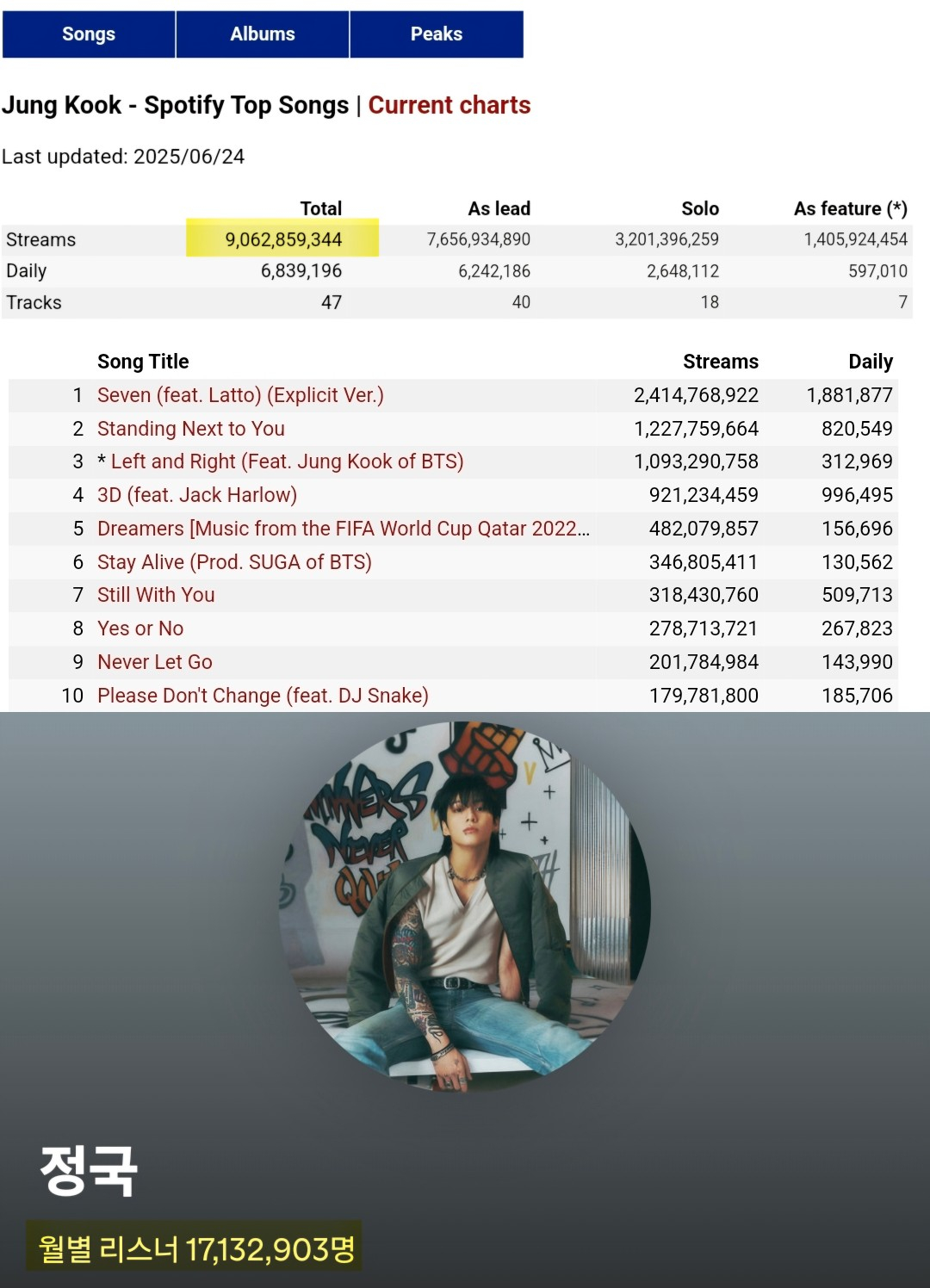 정국은 최근 세계 최대 음원 스트리밍 플랫폼 스포티파이에서 개인 계정(프로필) 모든 크레딧으로 누적 90억 스트리밍(필터링 전)을 기록했다.
