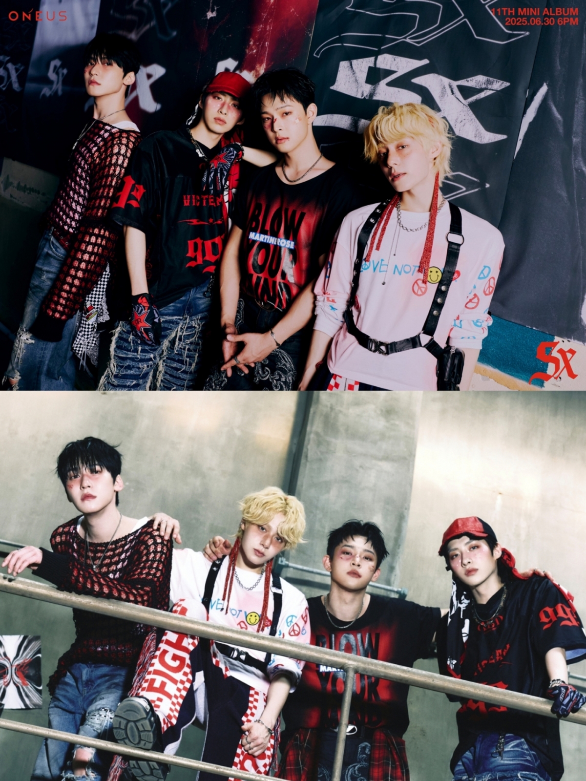 공개된 사진 속 원어스는 상처 메이크업으로 포인트를 준 가운데, 난간에 기댄 대담한 포즈로 거친 분위기를 배가했다. 원어스는 무심한 듯 시크한 눈빛으로 카메라를 응시하며 강렬하면서도 치명적인 매력을 강조했다. 스타일링 역시 새롭다. 이들은 디테일이 돋보이는 그래픽 티셔츠와 팬츠의 매치로 개성 넘치는 콘셉트 소화력을 입증했다.