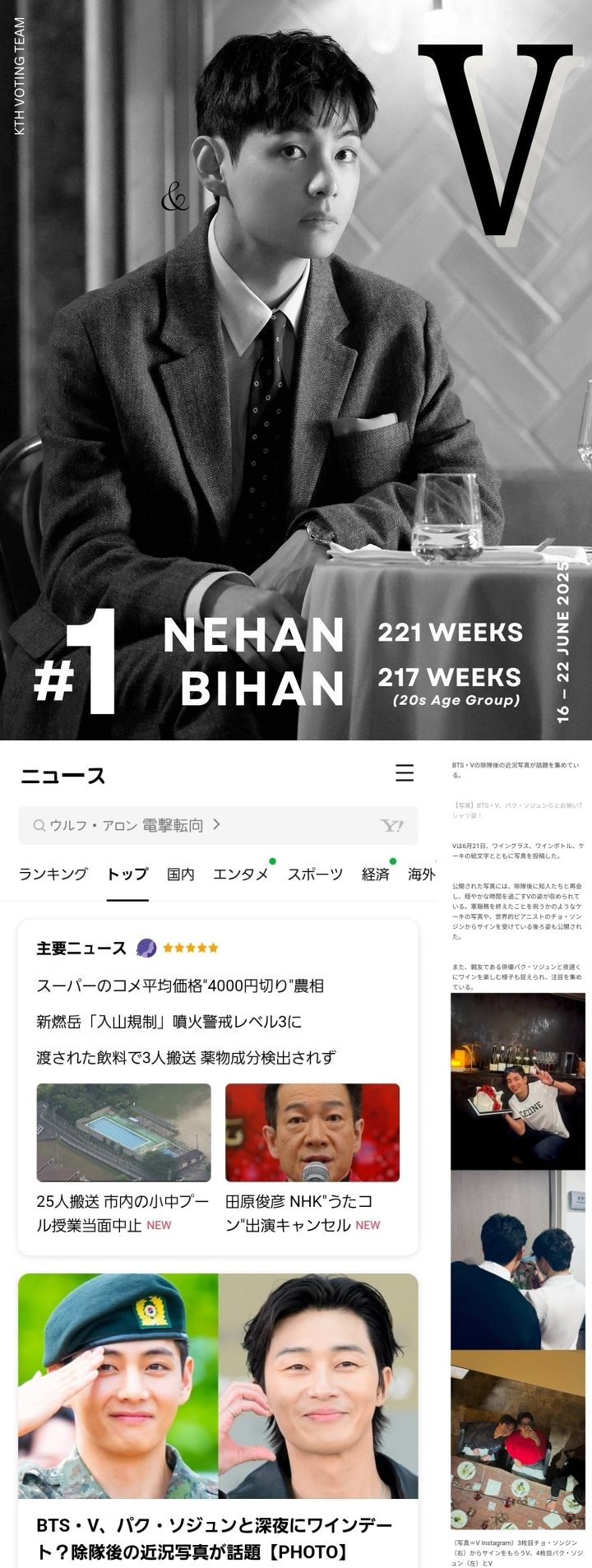 뷔는 X(구 트위터), 일본 구글 트렌드에서도 K팝 아티스트 최다 언급량을 기록한 스타답게 독보적인 인기를 누리며 화제성의 중심에 서있다. 일본 매체들은 지난 10일 뷔가 전역한 소식을 집중 취재한 이후에도 근황에 대해서도 자세히 전하고 있다.