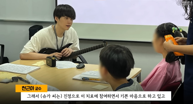 천교수는 '민윤기 치료센터'가 어떤 곳인지 묻자 "방탄소년단 슈가 씨가 재정적 후원과 재능 기부를 해 주신 덕분에 만들어진 곳"이라며 "자폐 스펙트럼 아동을 음악을 활용한 사회성 훈련을 통해 자립하게 하는 직업 재활 프로그램"이라고 밝혔다. 이어 "자기 감정이나 언어를 제대로 표현하기 힘든 아이들조차도 음악이란 매개를 통해 표현을 할 수 있고 또 자연스럽게 사람들과 어울릴 수 있도록 도와주겠다는 취지를 갖고 있는 센터"라고 설명했다.