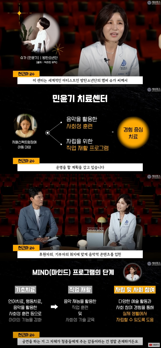 천근아 세브란스병원 소아정신과 교수는 "제가 오랜 시간 동안 상당히 마음 속에 간직하고 있던, 꿈을 이루는 기적 같은 센터다"라며 "민윤기 치료센터와 마인드 프로그램이 아마도 저의 오래 간직했던 꿈을 이룰 수 있는 계기가 될 거라고 조심스레 기대한다"라고 '민윤기 치료센터'에 대해 소개했다.