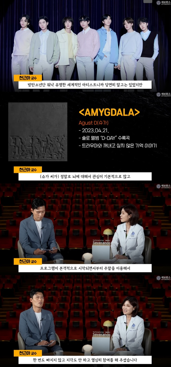 천교수는 "슈가 씨가 평소에도 뇌 분야에 관심이 많았다고 하더라. 그리고 또 하나는 슈가 씨가 발달장애 지인을 접하고 '사회적인 관심과 지원이 필요하구나'라는 생각을 했었다고 한다"라고 전했다.