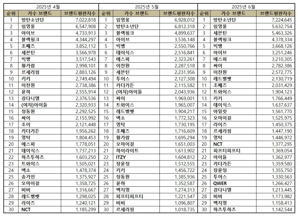 2025년 6월 가수 브랜드평판 30위 순위는 방탄소년단, 임영웅, 세븐틴, 블랙핑크, 빅뱅, 아이브, 에스파, 싸이, 이찬원, 레드벨벳, 조째즈, 트와이스, 키키, 데이식스, 아일릿, 오마이걸, 라이즈, 르세라핌, 영탁, NCT, 피프티피프티, 아이들, 카더가든, 장윤정, 투어스, QWER, 강다니엘, 비비, 백지영, 하츠투하츠 순으로 분석됐다.