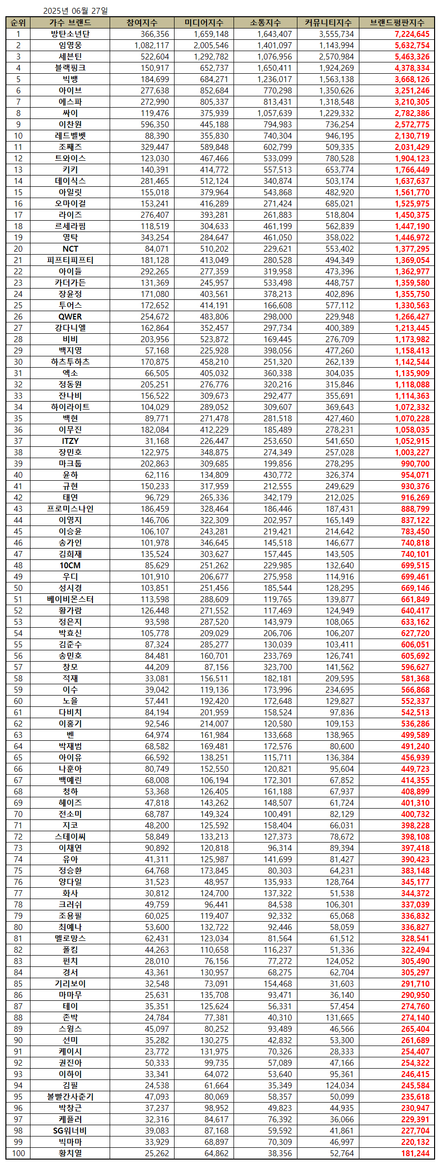 2025년 6월 가수 브랜드평판 30위 순위는 방탄소년단, 임영웅, 세븐틴, 블랙핑크, 빅뱅, 아이브, 에스파, 싸이, 이찬원, 레드벨벳, 조째즈, 트와이스, 키키, 데이식스, 아일릿, 오마이걸, 라이즈, 르세라핌, 영탁, NCT, 피프티피프티, 아이들, 카더가든, 장윤정, 투어스, QWER, 강다니엘, 비비, 백지영, 하츠투하츠 순으로 분석됐다.