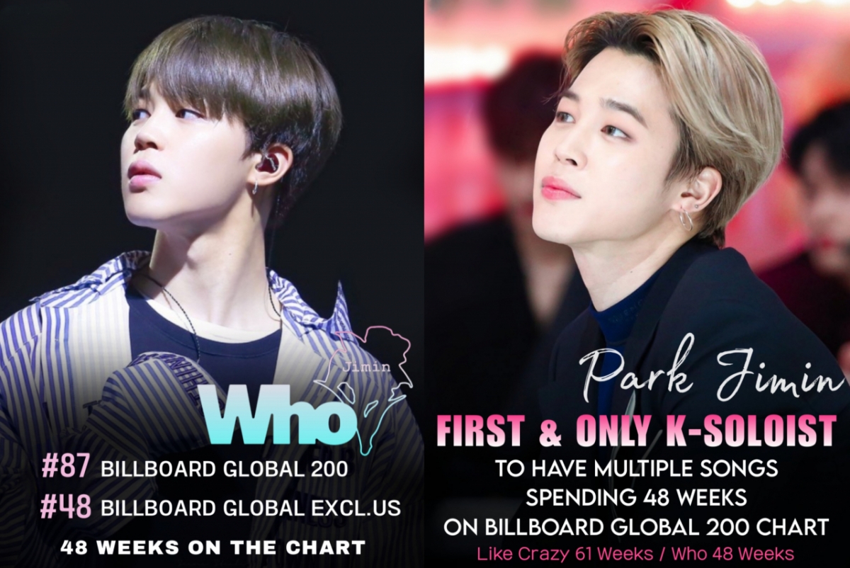 지민은 빌보드 '글로벌 200' 차트에서 48주 이상을 보낸 노래 2곡(라이크 크레이지, 후)를 보유한 최초이자 유일한 한국 솔로가수가 되는 새기록을 추가했다.