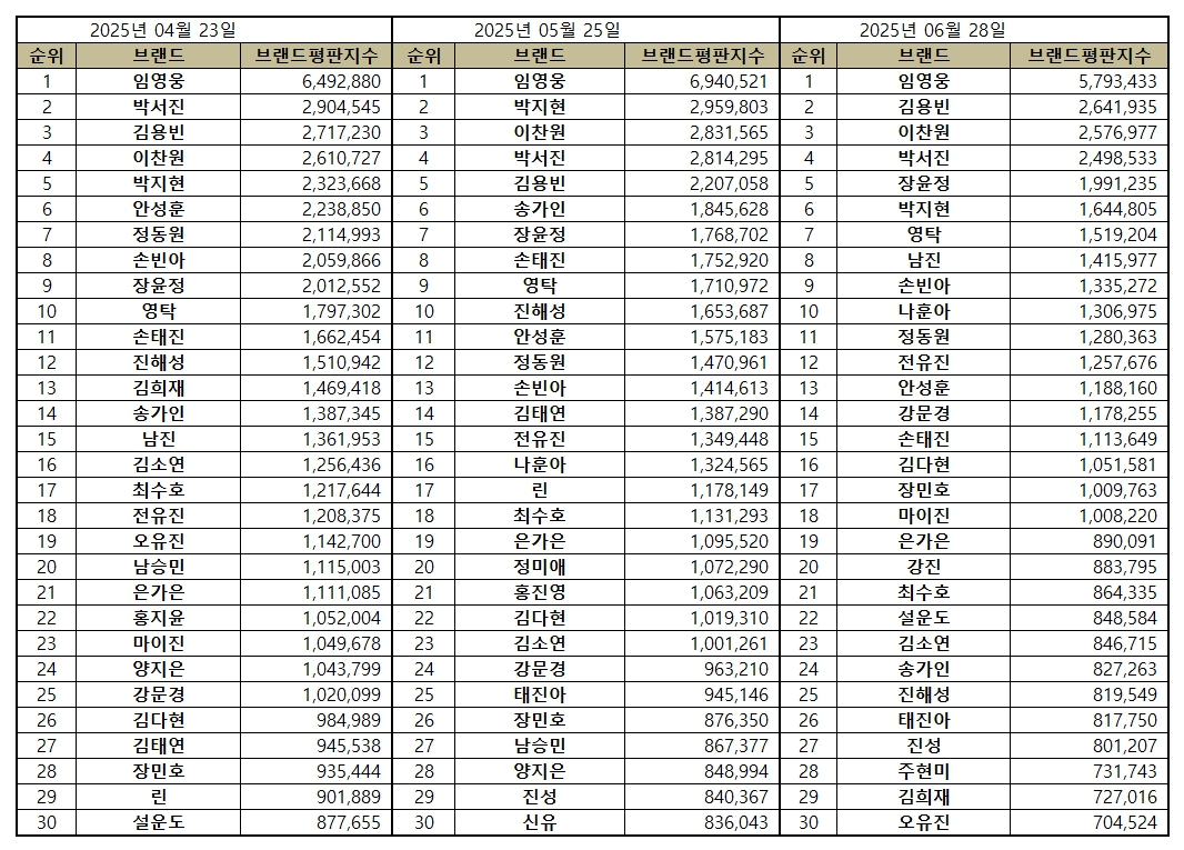 2025년 6월 트로트 가수 브랜드평판 30위 순위는 임영웅, 김용빈, 이찬원, 박서진, 장윤정, 박지현, 영탁, 남진, 손빈아, 나훈아, 정동원, 전유진, 안성훈, 강문경, 손태진, 김다현, 장민호, 마이진, 은가은, 강진, 최수호, 설운도, 김소연, 송가인, 진해성, 태진아, 진성, 주현미, 김희재, 오유진 순으로 분석됐다.