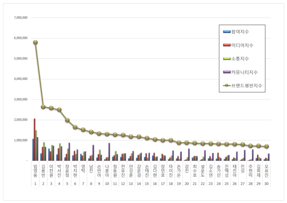 트로트 가수 브랜드평판 1위를 기록한 임영웅 브랜드는 참여지수 1,078,951 미디어지수 2,062,150 소통지수 1,499,801 커뮤니티지수 1,152,532가 되면서 브랜드평판지수 5,793,433으로 분석됐다.