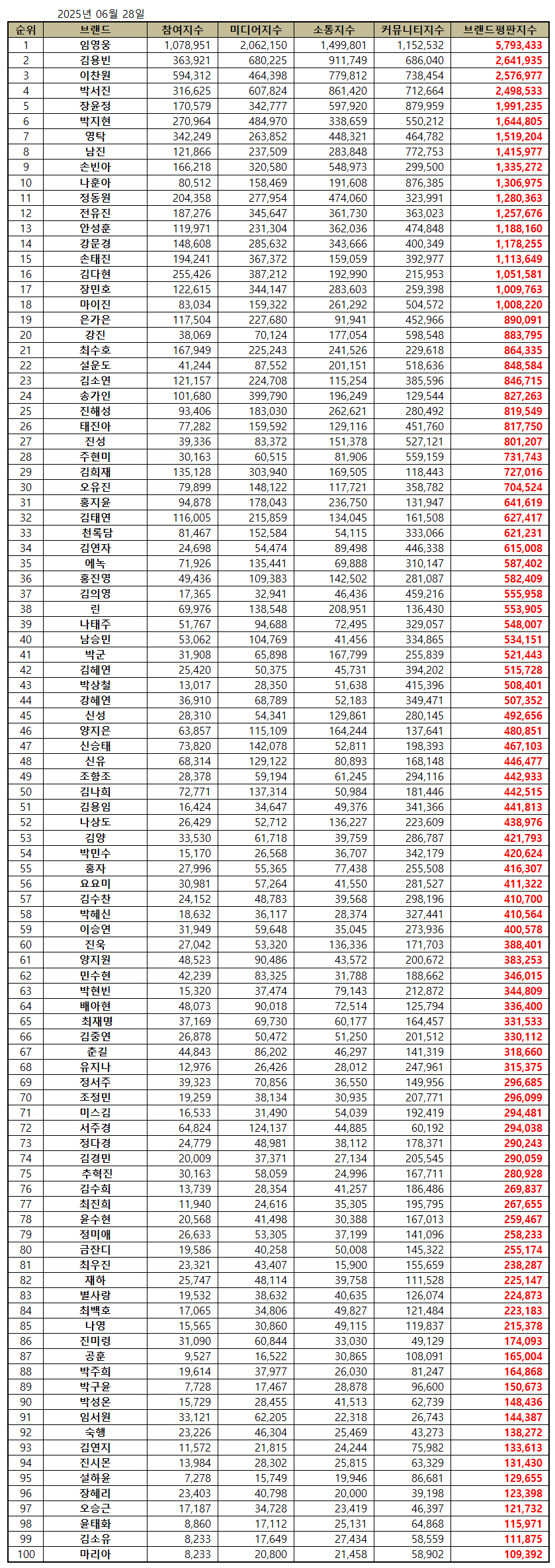임영웅은 6월 28일 한국기업평판연구소가 발표한 트로트 가수 브랜드평판 2025년 6월 빅데이터 분석결과, 1위를 차지했다. 임영웅은 이로써 54개월 연속 트로트 가수 브랜드평판 1위를 달성했다.