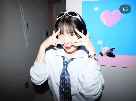 공개된 사진 속에서 현아는 단발머리 위에 선글라스를 착용한 채 하얀색 상의와 푸른색 넥타이 차림으로 수수한 매력을 뽐내고 있다. 특히 청량한 아쿠아 블루 네일 컬러와 붉은색 립스틱이 대비돼 발랄한 모습이다.