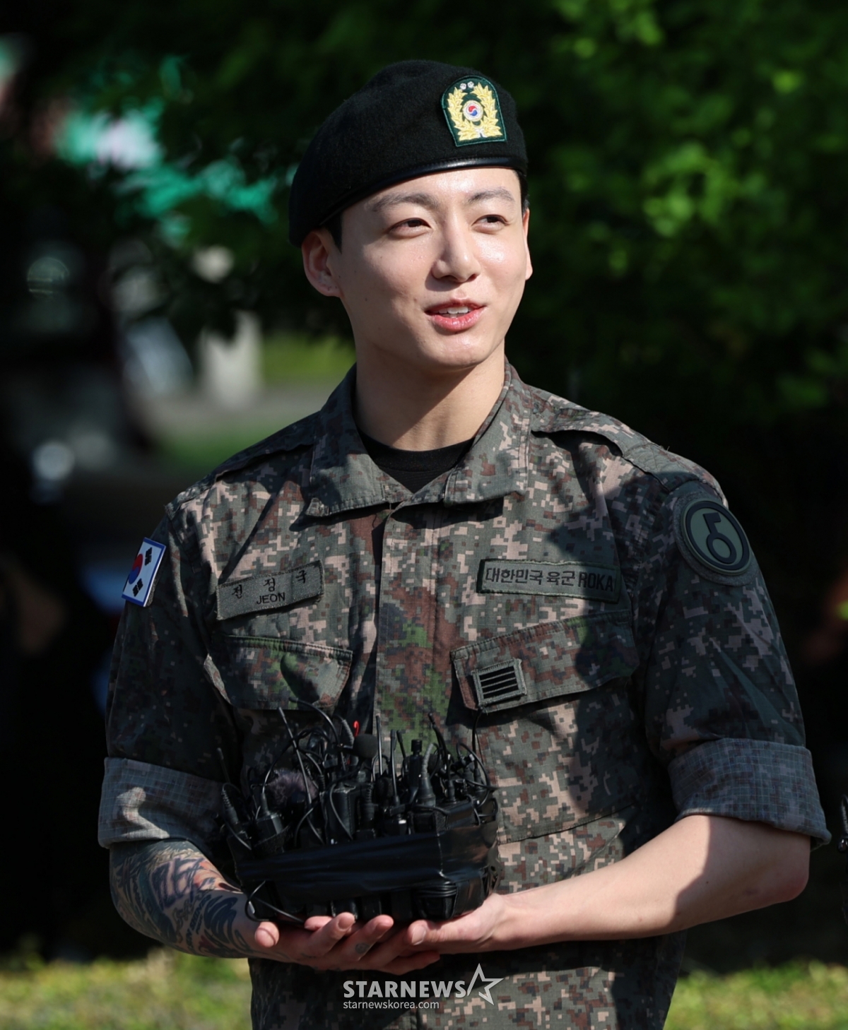 (연천=뉴스1) 권현진 기자 = 방탄소년단(BTS)의 정국이 11일 오전 경기도 연천군 연천공설운동장에서 전역 인사를 하고 있다. 정국과 지민은 지난 2023년 12월 입대해 경기도 연천에 위치한 육군 제5보병사단에서 약 1년 7개월간 병역의 의무를 성실히 수행했다. 2025.6.11/뉴스1 Copyright © 뉴스1. All rights reserved. 무단 전재 및 재배포, AI학습 이용 금지. /사진=(연천=뉴스1) 권현진 기자