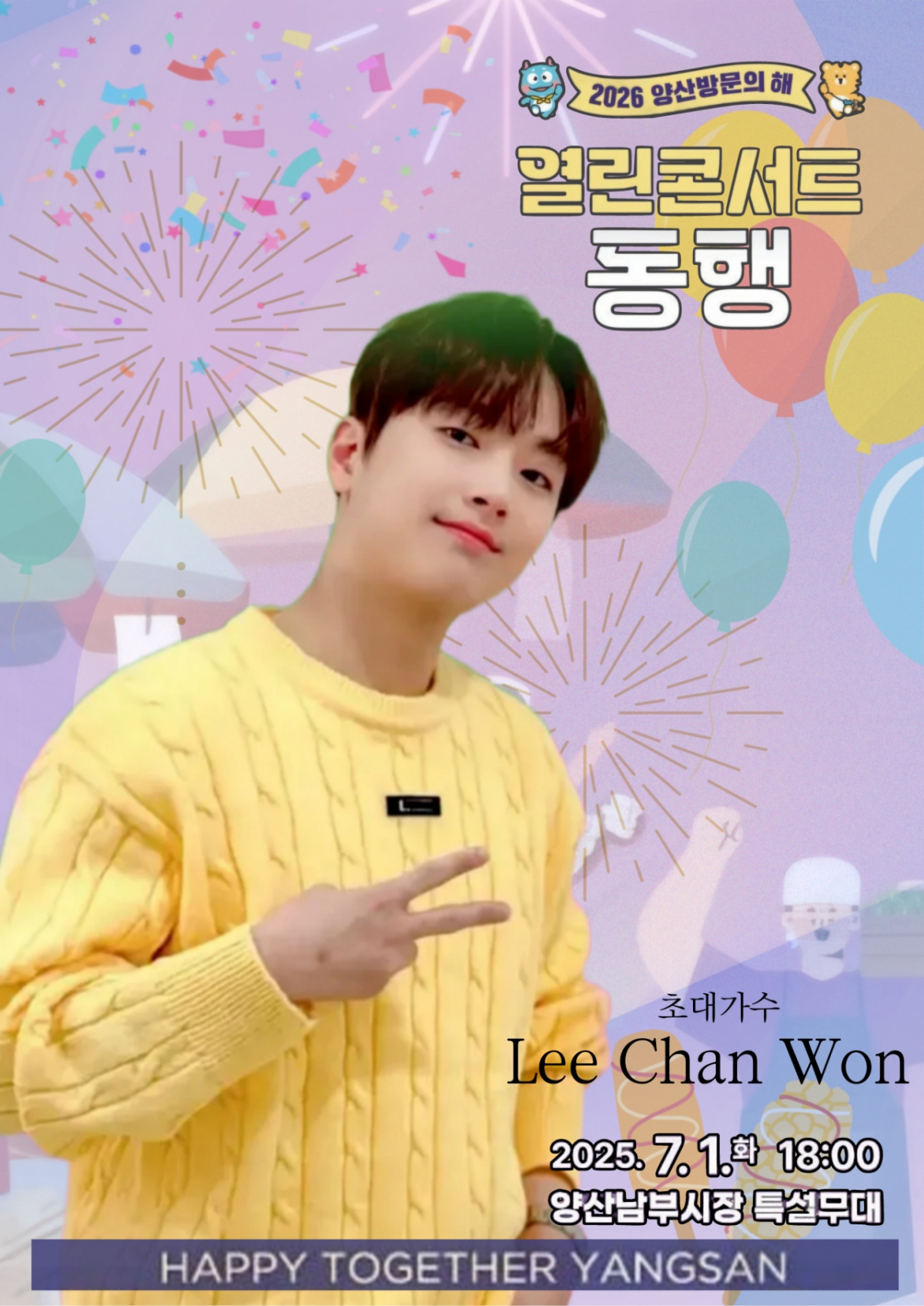 이찬원은 7월 1일 오후 6시 경남 양산시 중부동 양산남부시장 특설무대에서 개최되는 '열린콘서트 동행' 공연에 출연한다. 이번 행사는 2026년 양산시 승격 30주년을 앞두고 시민 화합과 민생경제 회복을 위해 마련됐다.