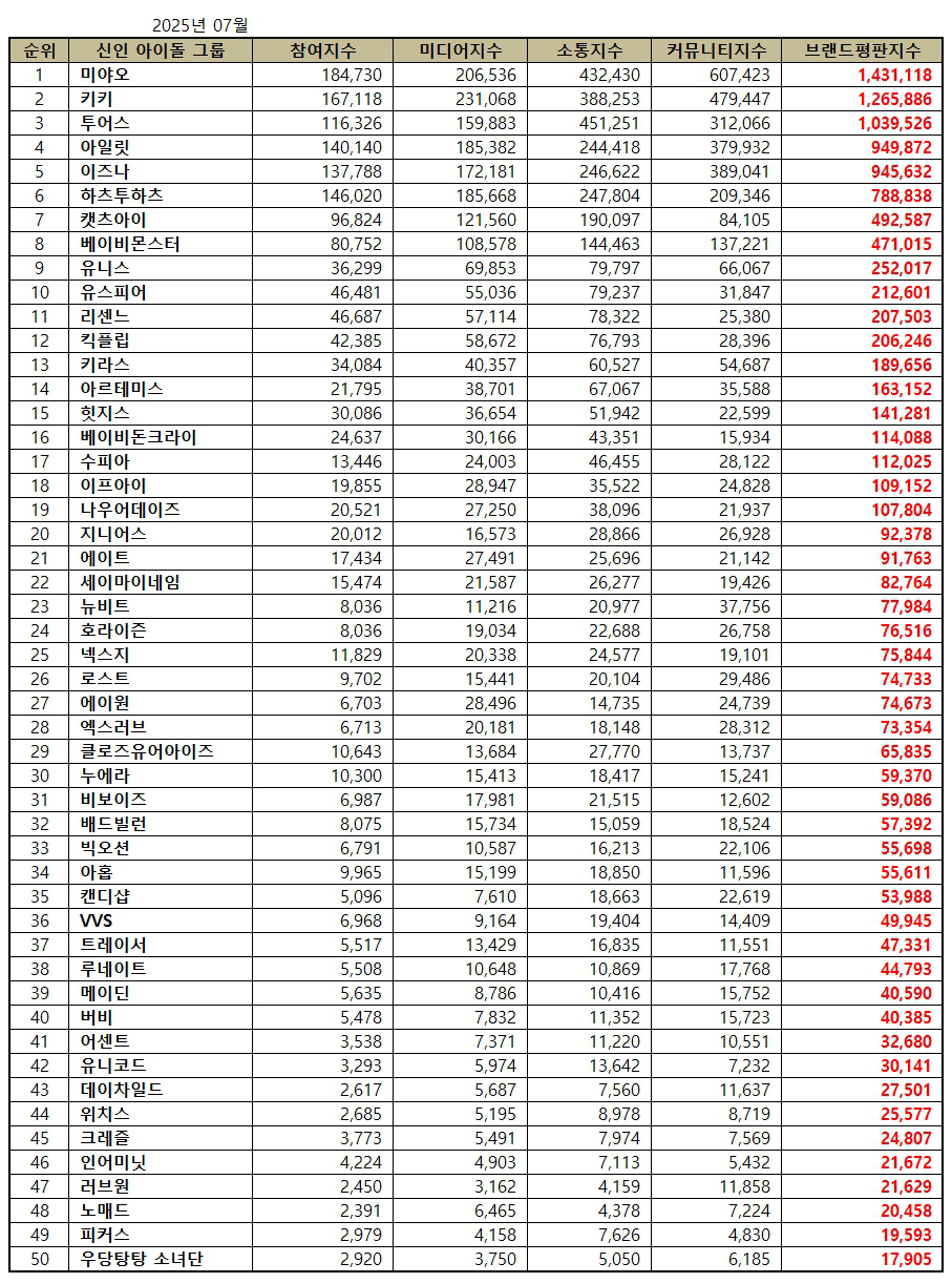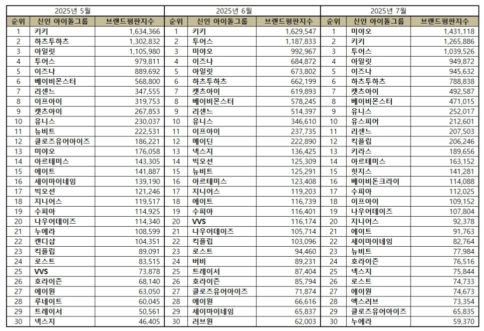 2025년 7월 신인 아이돌그룹 브랜드평판 30위 순위는 미야오, 키키, 투어스, 아일릿 , 이즈나, 하츠투하츠, 캣츠아이, 베이비몬스터, 유니스, 유스피어, 리센느, 킥플립, 키라스, 아르테미스, 힛지스, 베이비돈크라이, 수피아, 이프아이, 나우어데이즈, 지니어스, 에이트, 세이마이네임, 뉴비트, 호라이즌, 넥스지, 로스트, 에이원, 엑스러브, 클로즈유어아이즈, 누에라 순으로 분석됐다.