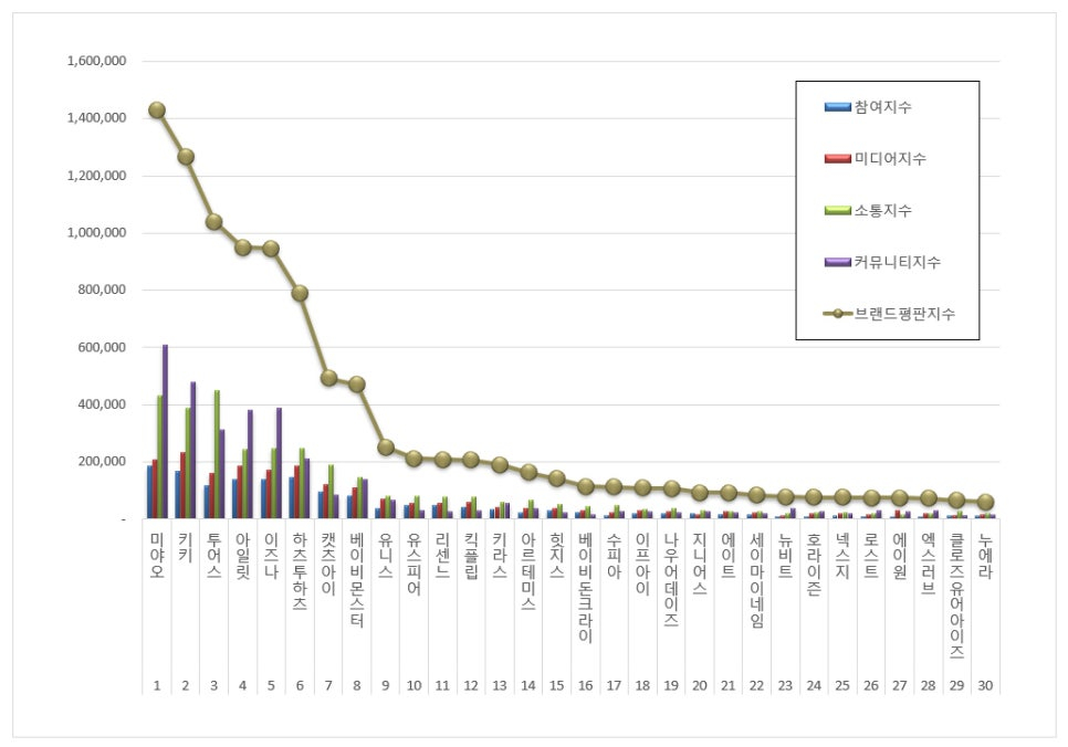 5위, 이즈나 (izna·마이, 방지민, 윤지윤, 코코, 유사랑, 최정은, 정세비 ) 브랜드는 참여지수 137,788 미디어지수 172,181 소통지수 246,622 커뮤니티지수 389,041이 되면서 브랜드평판지수 945,632로 분석됐다. 지난 6월 브랜드평판지수 684,872와 비교해보면 38.07% 상승했다.