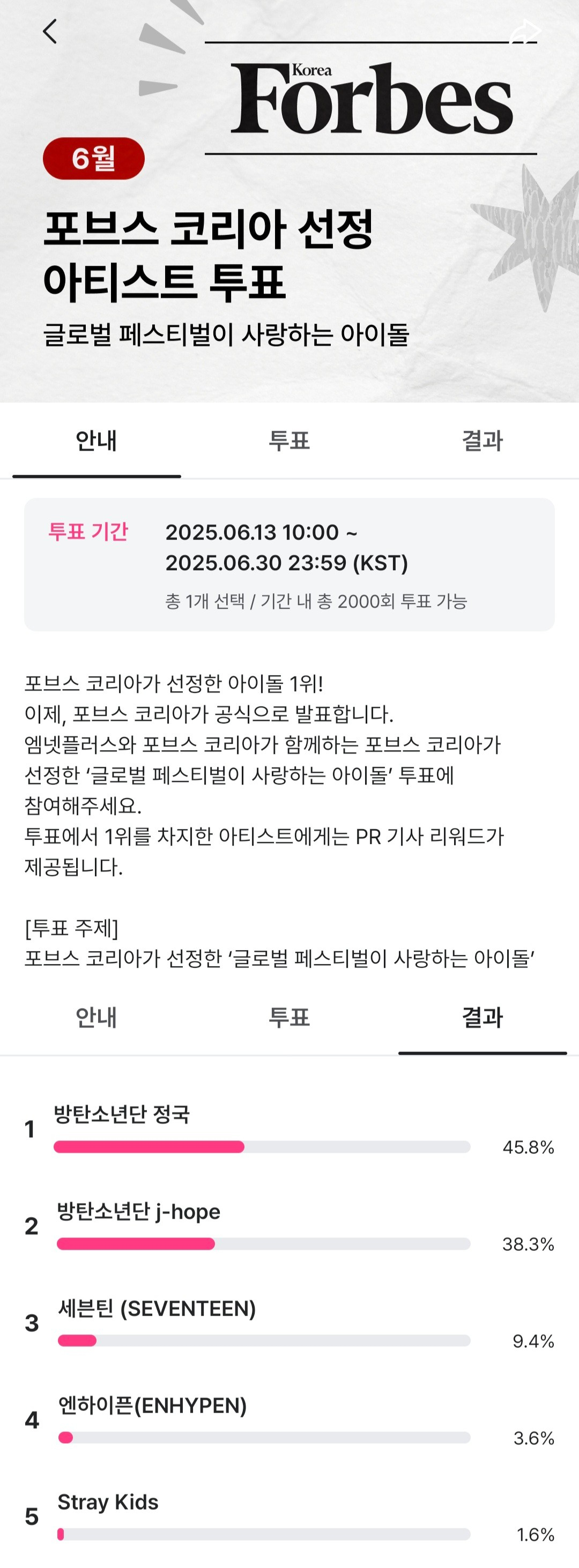 정국에 이어 2위 방탄소년단 제이홉, 3위 세븐틴, 4위 엔하이픈, 5위 스트레이 키즈, 6위 에이티즈, 7위 에스파 순이었다.