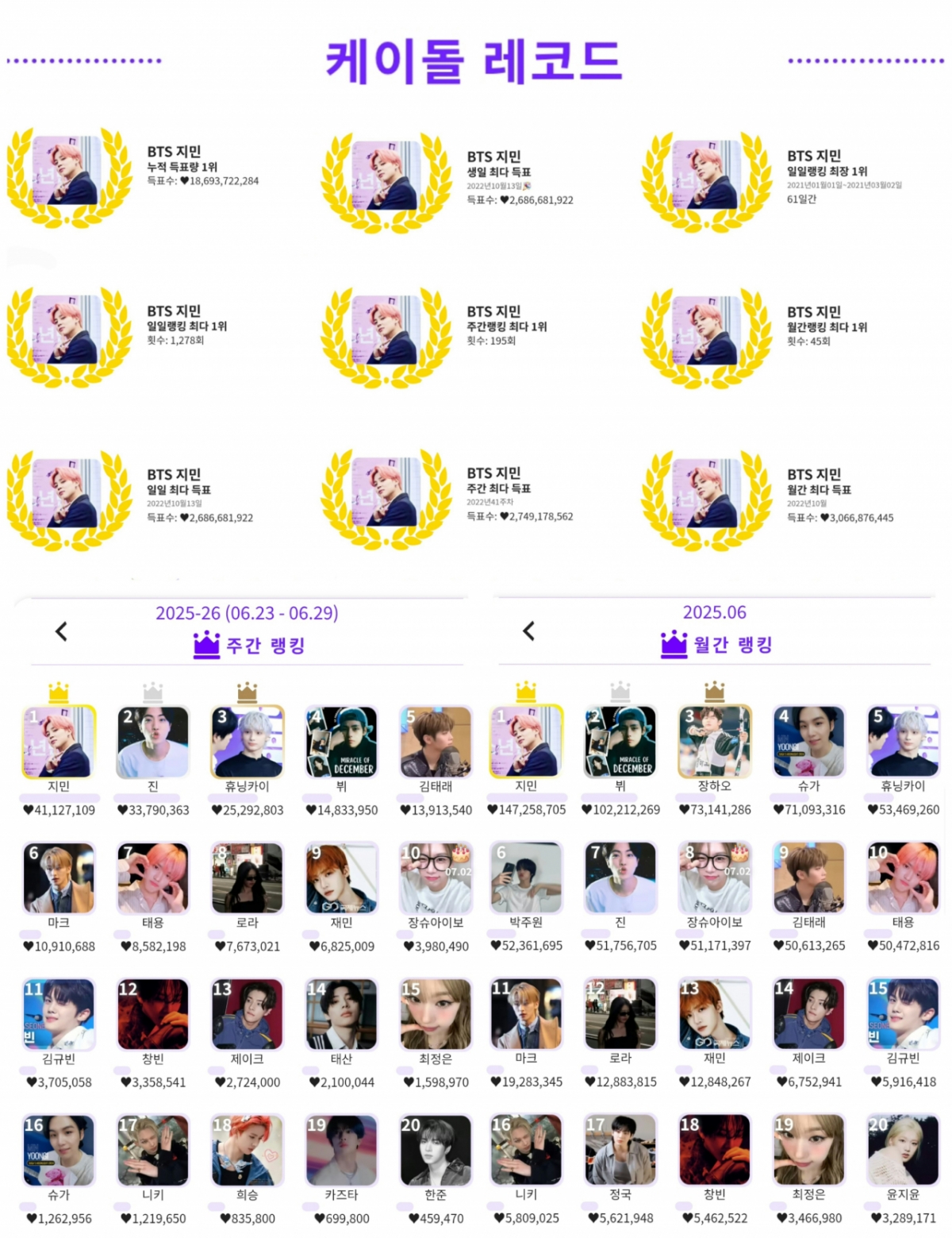지민은 글로벌 K팝 아이돌 인기투표 '케이돌(KDOL)'에서 6월 30일 자정 마감된 월간랭킹 결과 총 1억 4725만 8705 하트를 획득하며 1위에 올랐다. 45개월째 월간랭킹 1위의 대기록이다.