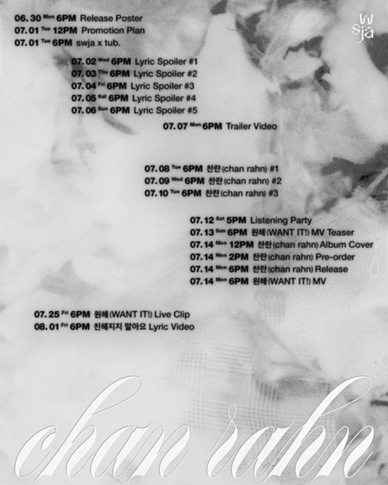 지난 2일에는 수록곡 '러브마이셀프(lovemyself)'의 리릭 스포일러 비디오가 먼저 공개되며 앨범에 대한 궁금증을 한층 고조시켰다. 영상 속 가사들은 새 EP '찬란(chan rahn)'이 담아낼 내면의 이야기와 정서를 암시하며 리스너들의 호기심을 자극했다.