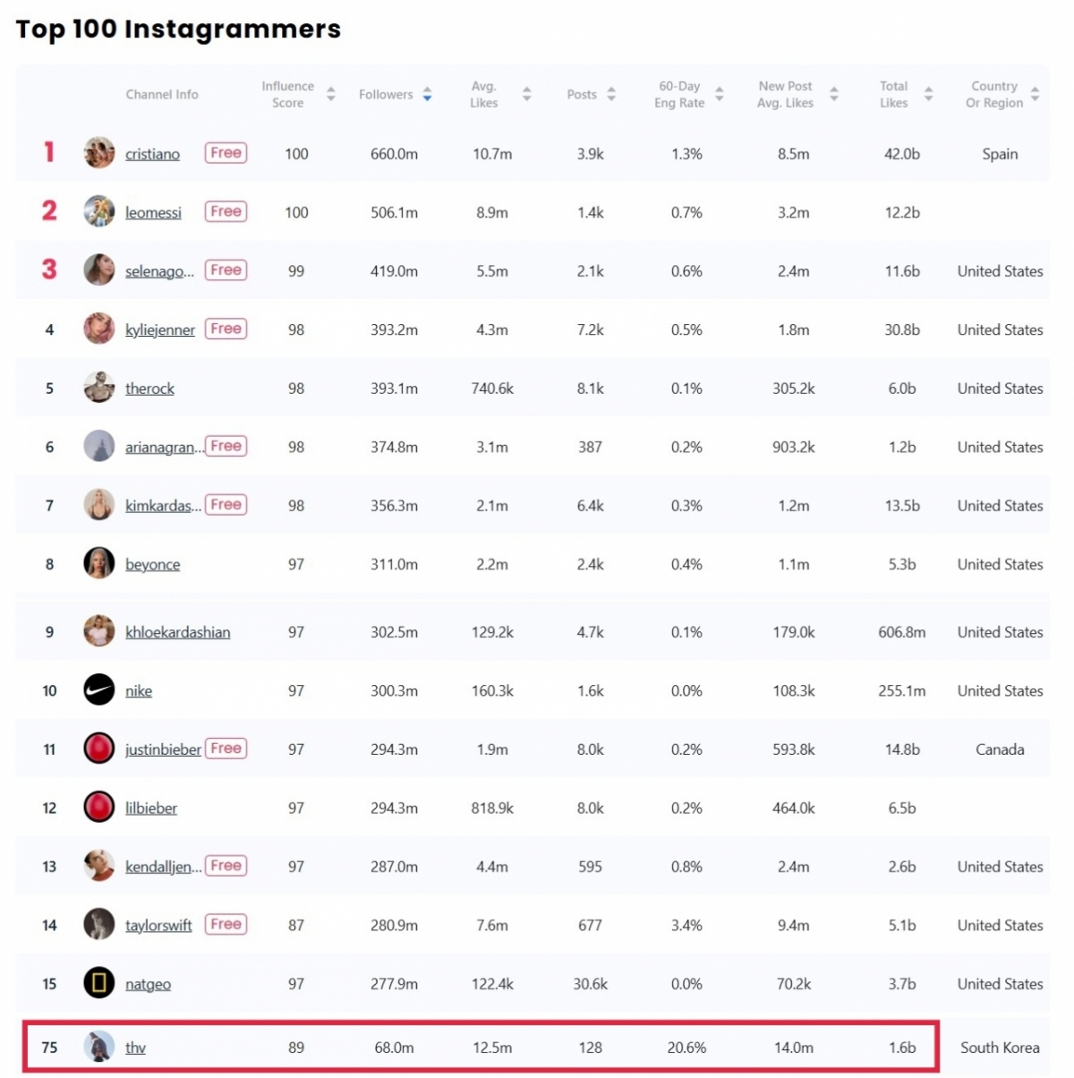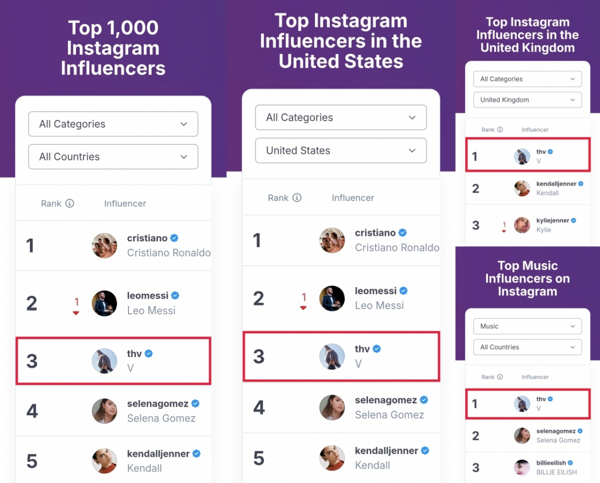 인플루언서 분석업체 하이프오디터에 따르면 뷔는 인스타그램에서 '전 세계에서 가장 영향력 있는 인플루언서 톱 1000' 3위에 올랐다.