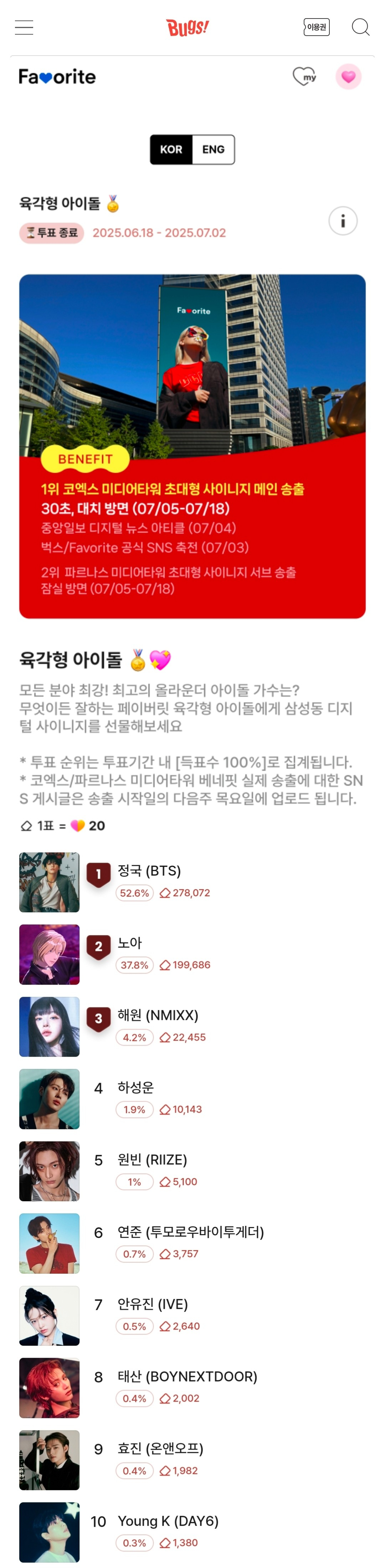 1위 정국에 이어 2위 플레이브(PLAVE) 버추얼 가수 노아, 3위 엔믹스(NMIXX) 혜원, 4위 하성운, 5위 라이즈(RIIZE) 원빈, 6위 투모로우바이투게더(TXT) 연준, 7위 아이브(IVE) 안유진 순이었다.