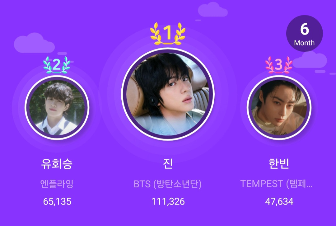 진은 지난 6월 1일부터 15일까지 글로벌 팬덤 플랫폼 스타 플래닛(STAR PLANET)에서 진행한 6월 아이돌 랭킹에서 11만 1326표로 압도적인 표수를 자랑하며 1위에 올랐다.