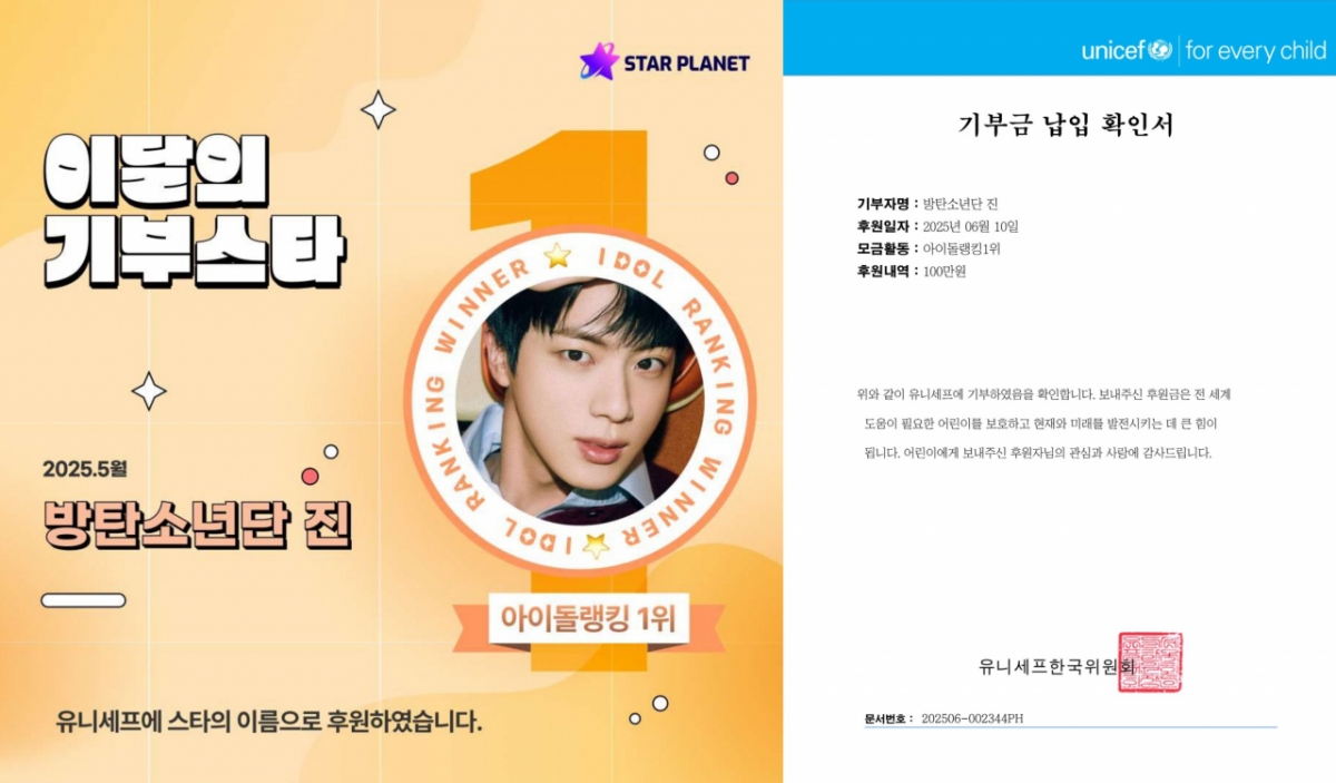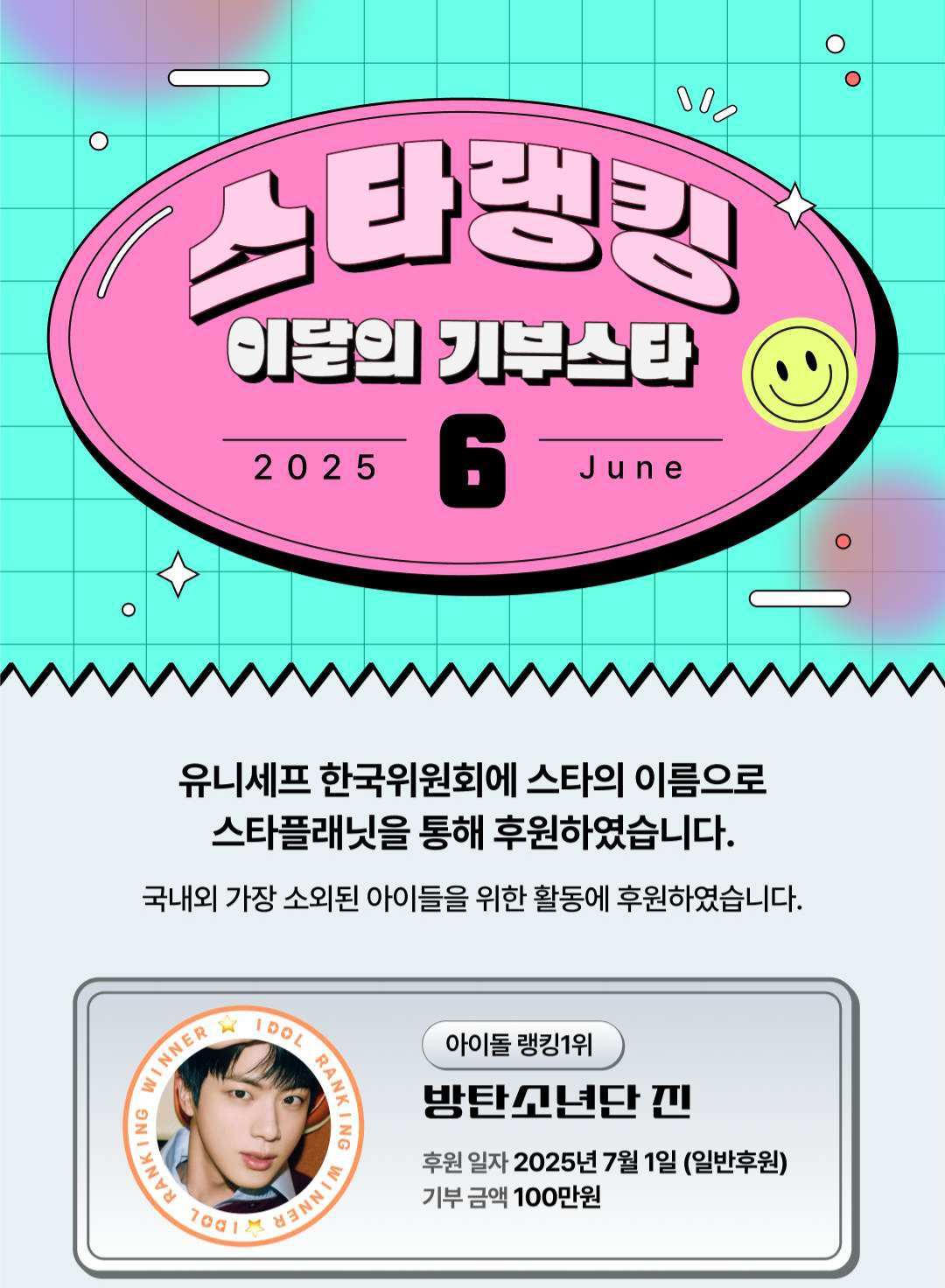 스타 플래닛은 6월 아이돌 랭킹 1위를 차지한 진의 이름으로 7월 1일 유니세프 한국위원회에 100만 원의 기부금을 전달했다고 밝혔다.