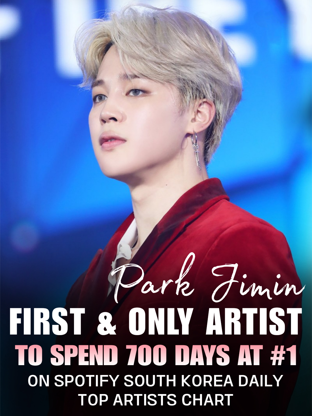 세계 최대 음원 플랫폼 스포티파이의 7월 5일자 차트 업데이트에 따르면, 지민은 스포티파이 한국 '데일리 톱 아티스트' 차트에서 700일째 정상에 올랐다. 해당 차트 역사상 최초이자 유일한 누적 700회 1위 신기록이다.