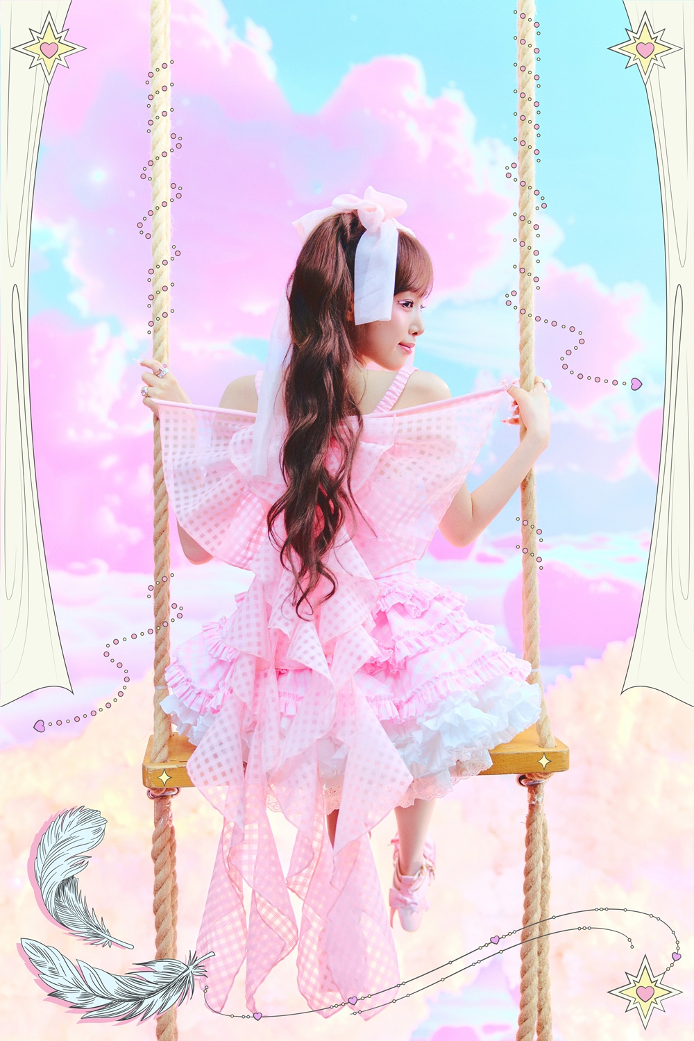 사진 속 최예나는 마치 하늘에 떠 있는 공중그네에 앉아 어딘가를 응시하고 있다. 핑크색 레이스가 돋보이는 깜찍한 드레스를 입고 머리에는 리본을 착용해 엔젤 같은 분위기를 자아냈다.