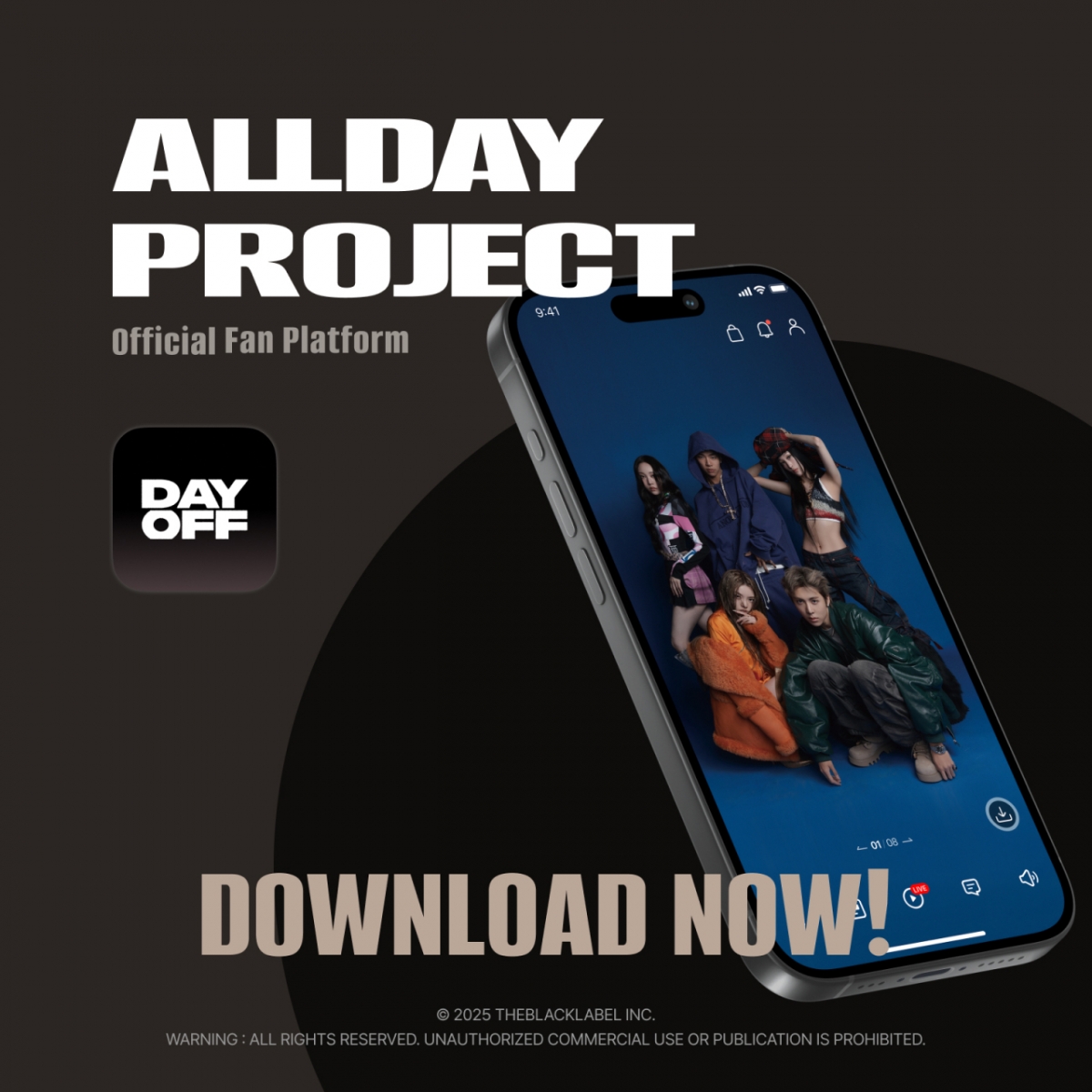 지난 7일 정오 전 세계 156개국에 동시 출시된 'DAYOFF'는 24시간 가입자 수 4만 명을 돌파했으며, iOS 기준 전체 인기 앱 3위, 소셜네트워킹 부문 1위를 달성하며 ALLDAY PROJECT를 향한 뜨거운 관심을 입증했다.