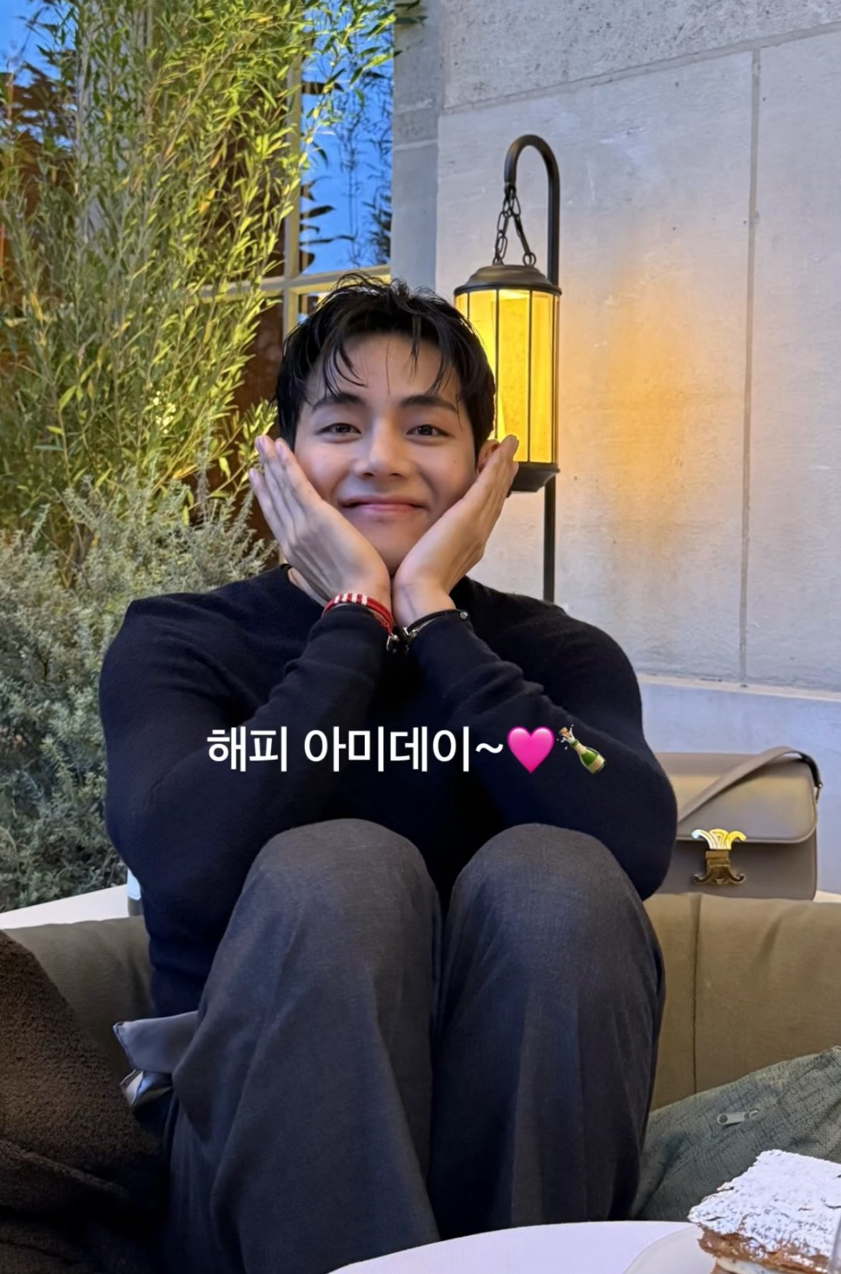 뷔는 9일 위버스에 "해피 아미데이", "오늘 하루 제일 행복하게 보내세요"라는 글과 함께 두 장의 사진을 게재했다.