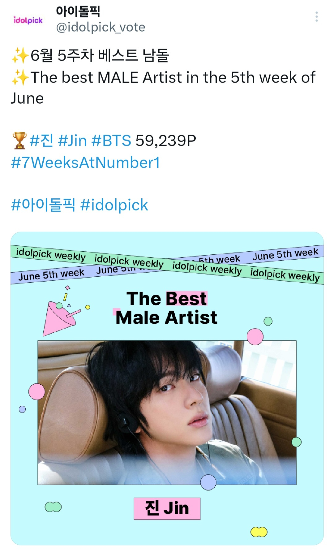 방탄소년단(BTS) 진이 아이돌픽(idolpick) 위클리 투표에서 1위를 차지하며 인기를 빛냈다.